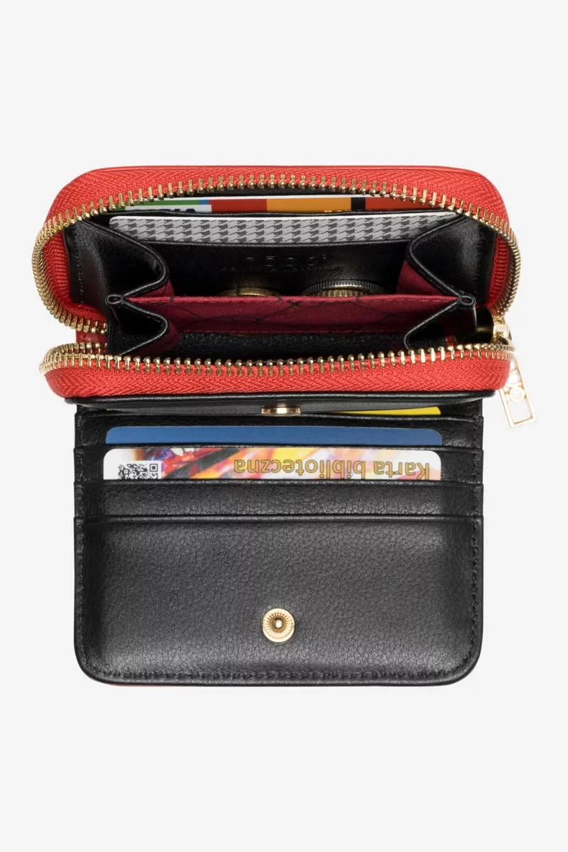 Malá dámská peněženka je vyrobena z hladké přírodní kůže. Uvnitř je dvanáct kapes na karty. Kapsa na zip má přihrádku, kam se vejdou bankovky a mince. Model je zabalen v elegantní červené krabičce. Ideální jako dárek!