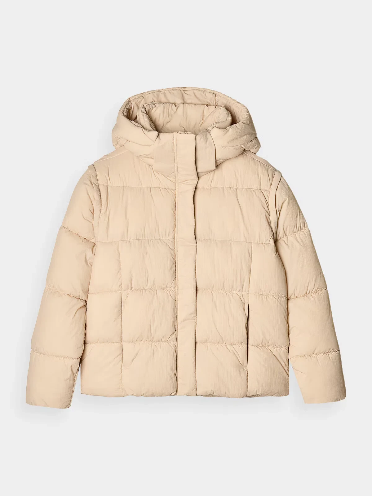 Dámská zimní péřová bunda je vybavená odnímatelnou kapucí s možností nastavení objemu. Krk je krytý vysokým límcem, který dále chrání před chladem a větrem.