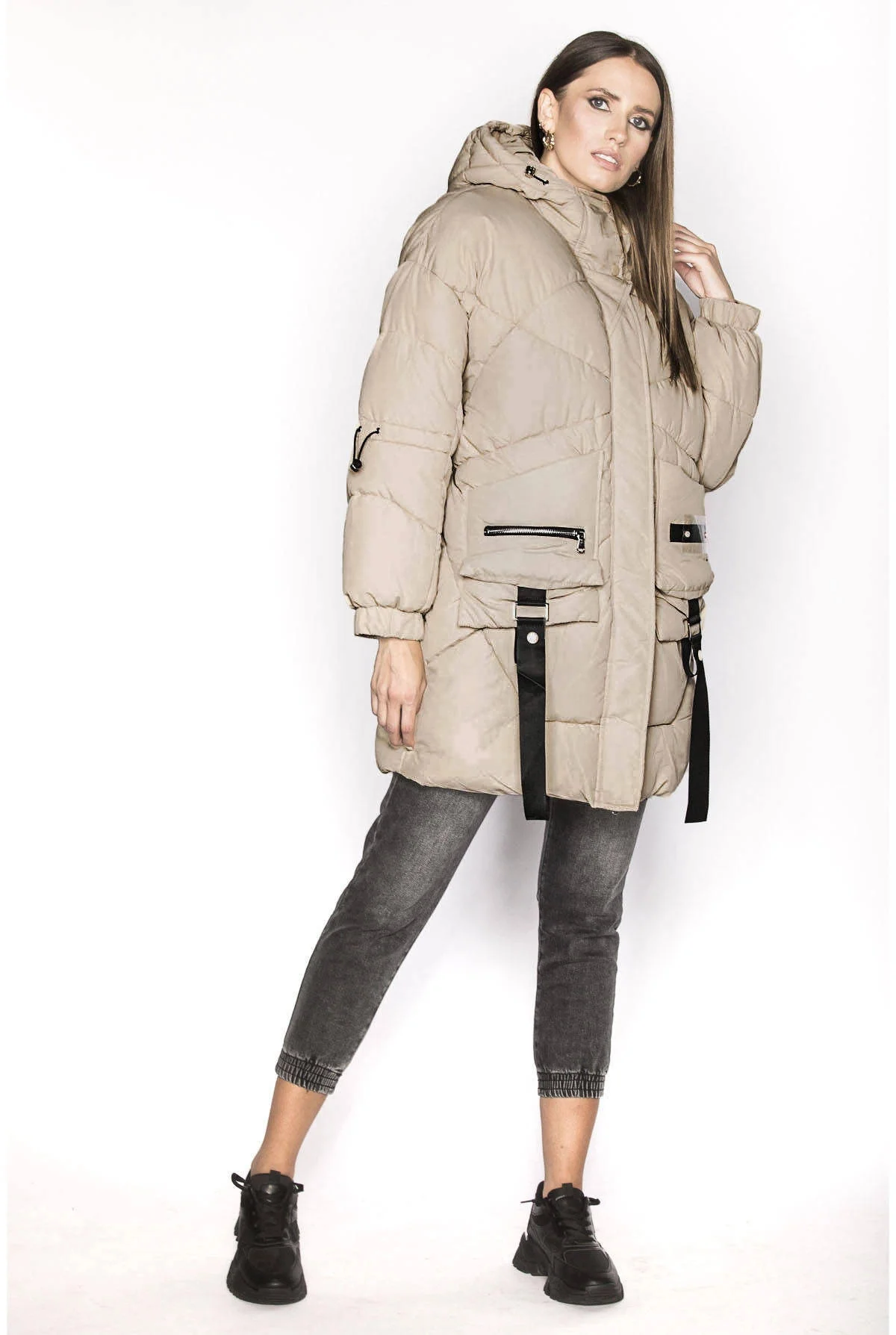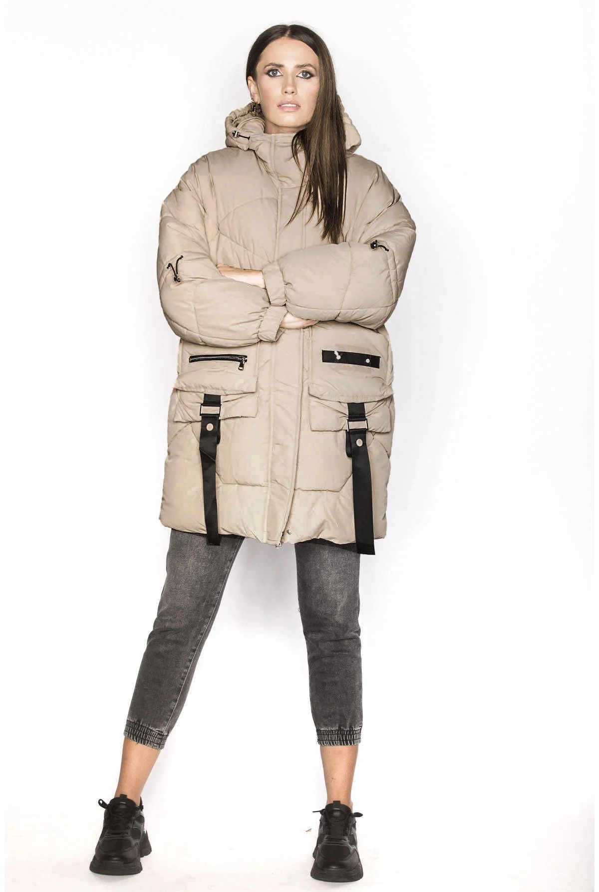 Bunda má střih typu oversize, má dvě kapsy a zapíná se dvousměrným zipem a panelem s patentkami. Model má kapuci, kterou není možné odepnout. Široké rukávy jsou olemované gumou. Bunda má délku do poloviny stehen.