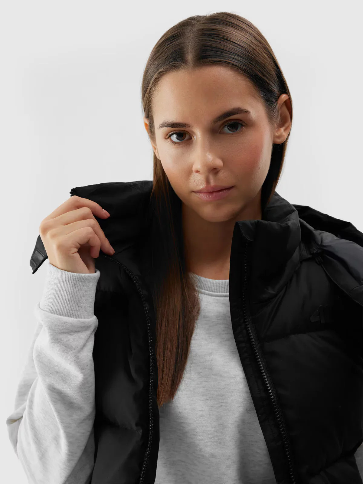 Dámská krátká péřová vesta se zvýšeným objemem a hmotností výplně je ideální volbou pro chladné a zimní dny při každodenních nebo sportovních aktivitách.