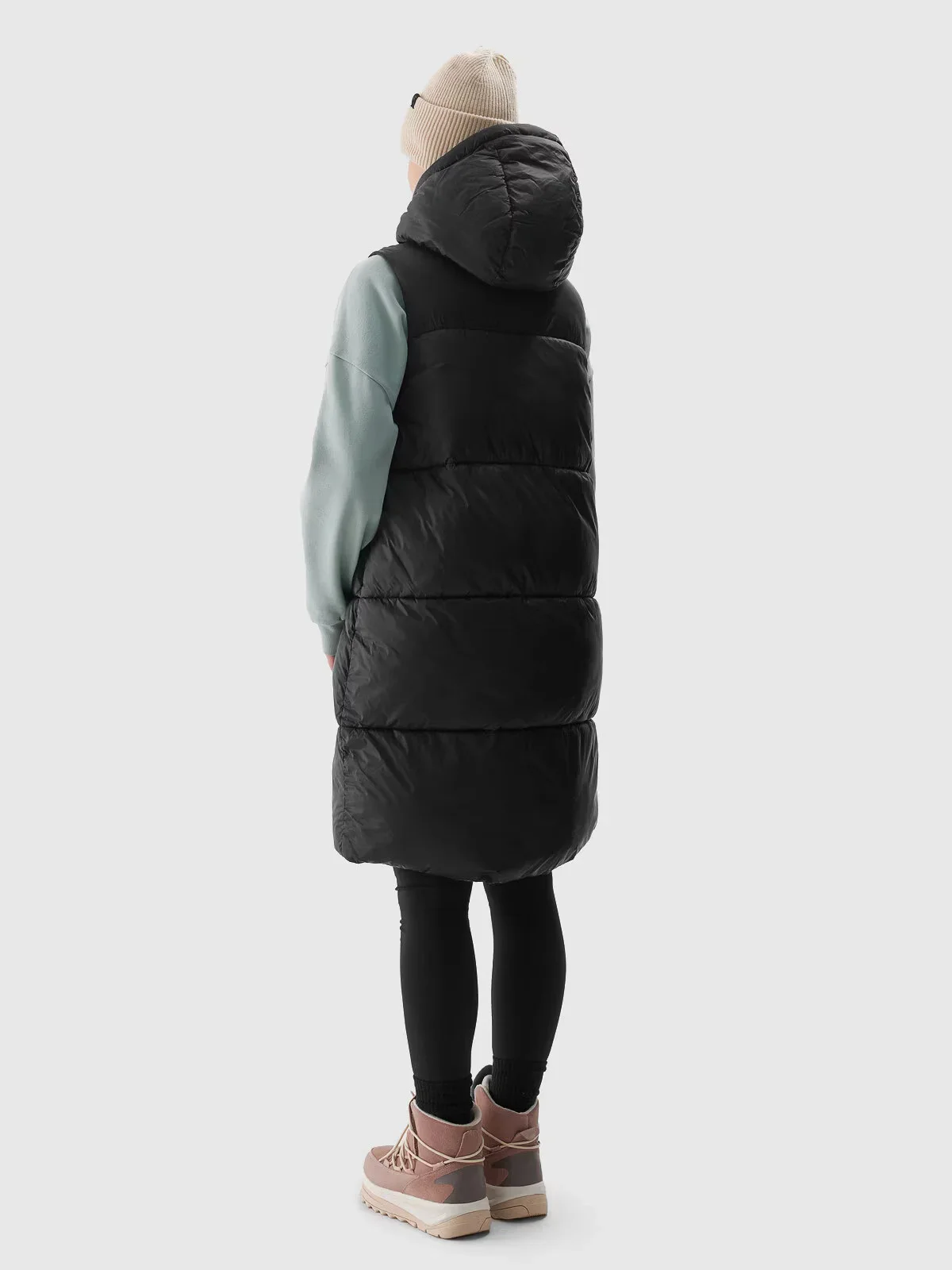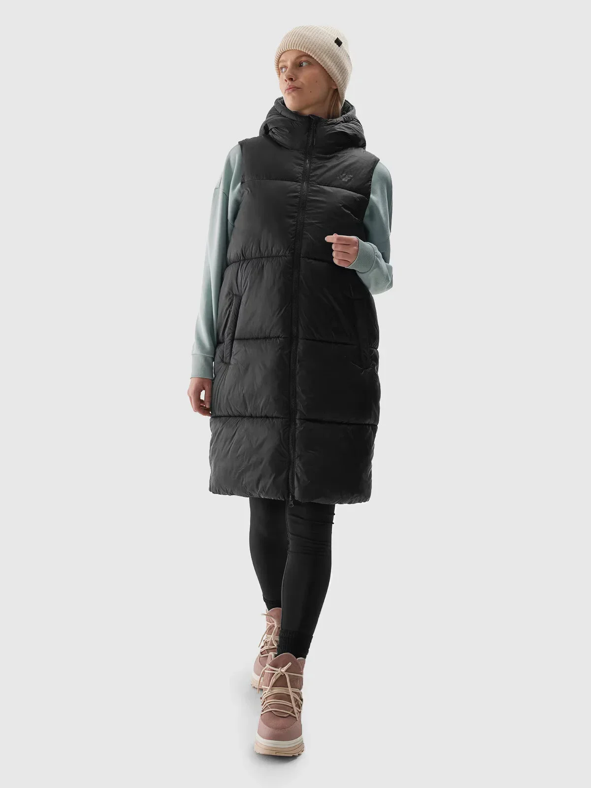 Dámská dlouhá vesta se syntetickým peřím, které je odolnější a snadněji se udržuje než přírodní peří. I když je vystavena vlhkosti, déle si zachovává své izolační vlastnosti a mnohem rychleji schne.