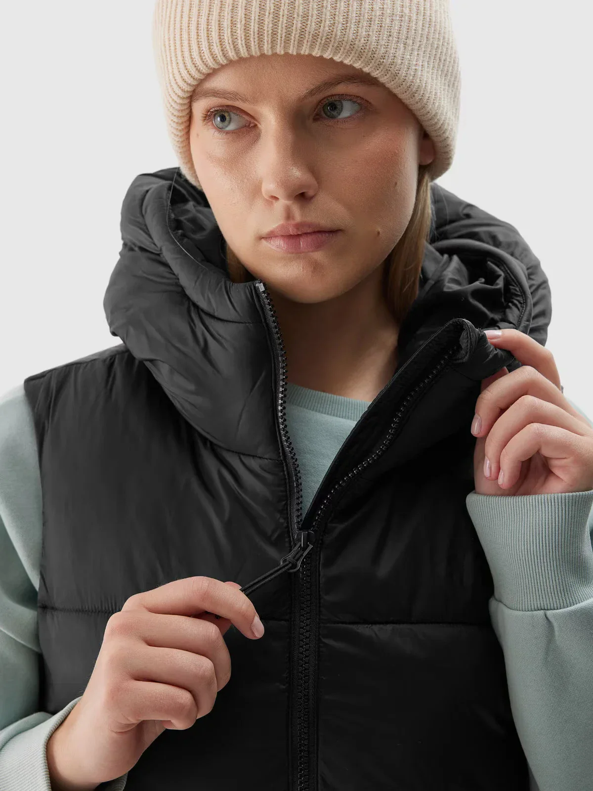 Dámská dlouhá péřová vesta je vybavena integrovanou kapucí s nastavením objemu. Krk je krytý vysokým límcem, který dále chrání před chladem a větrem.