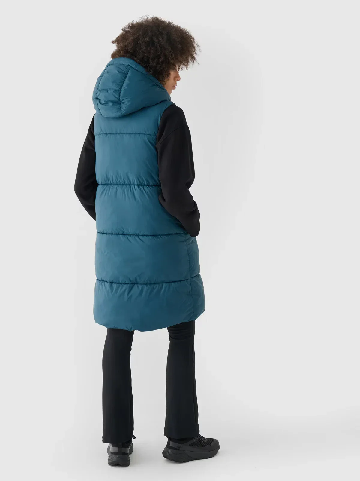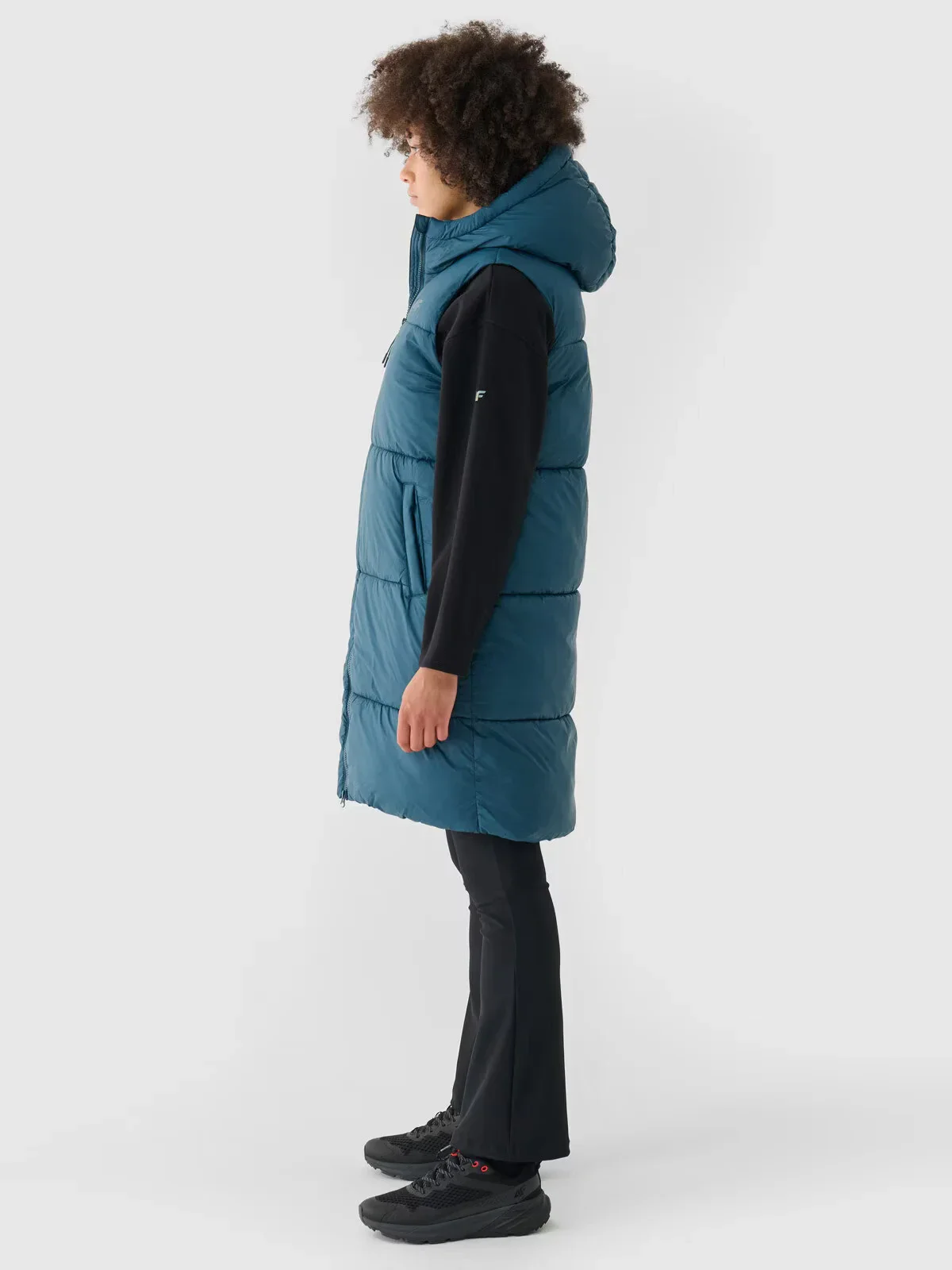 Dámská dlouhá vesta se syntetickým peřím, které je odolnější a snadněji se udržuje než přírodní peří. I když je vystavena vlhkosti, déle si zachovává své izolační vlastnosti a mnohem rychleji schne.
