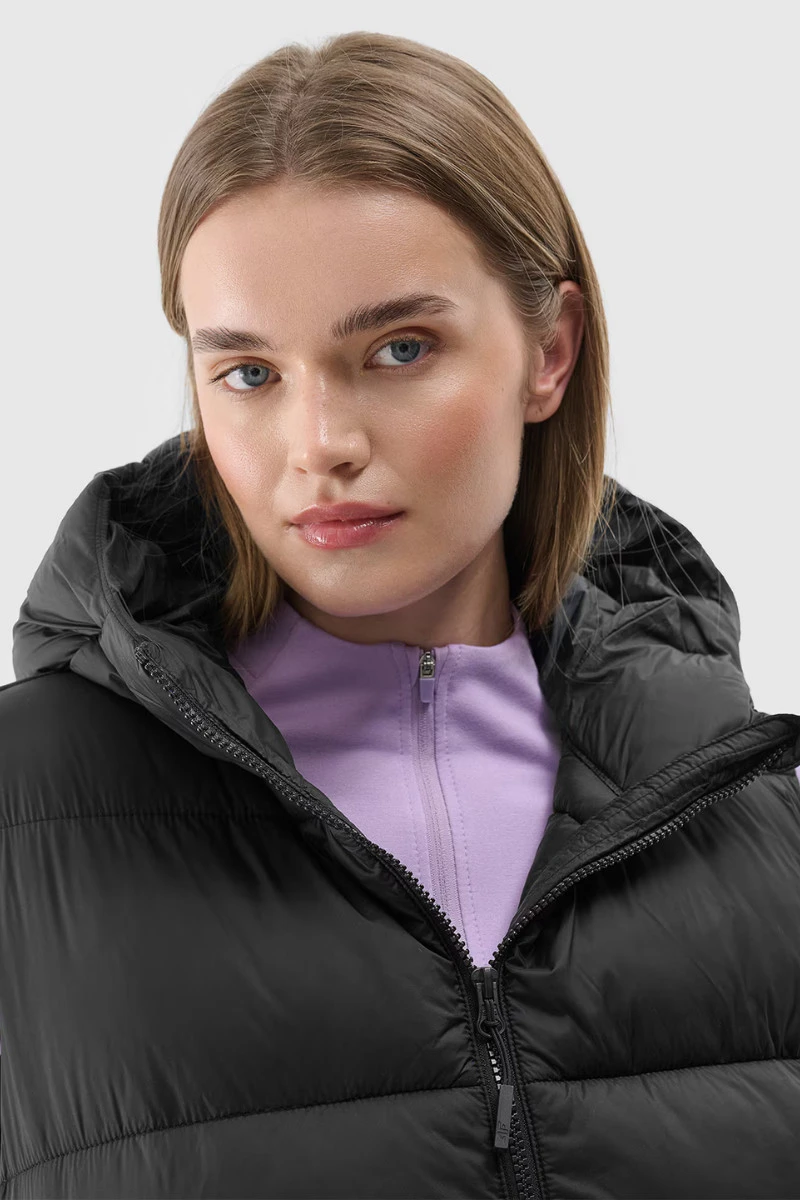 Dámský péřový vestě s kapucí má optimální gramáž výplně, díky které ji lze nosit během každodenních a sportovních aktivit v chladnějších dnech. Vesta má klasické horizontální prošívání, které se skládá z paralelních pásů probíhajících napříč bundou. Tento typ prošívání zajišťuje dobrou tepelnou izolaci a odpovídající kompresibilitu bundy. Má regular střih, který se pohodlně přizpůsobí siluetě a standardní délku sahající až po linii boků. Hydrofoobní impregnační vrstva pokrývá vnější vrstvu materiálu a chrání ji před absorpcí vody. Vrstva způsobuje, že se vlhkost kondenzuje na povrchu tkaniny nebo pleteniny a poté svobodně stéká. Hlavní materiál: Polyamid 100% Podšívka: Polyamid 100% Výplň: Polyester 100%