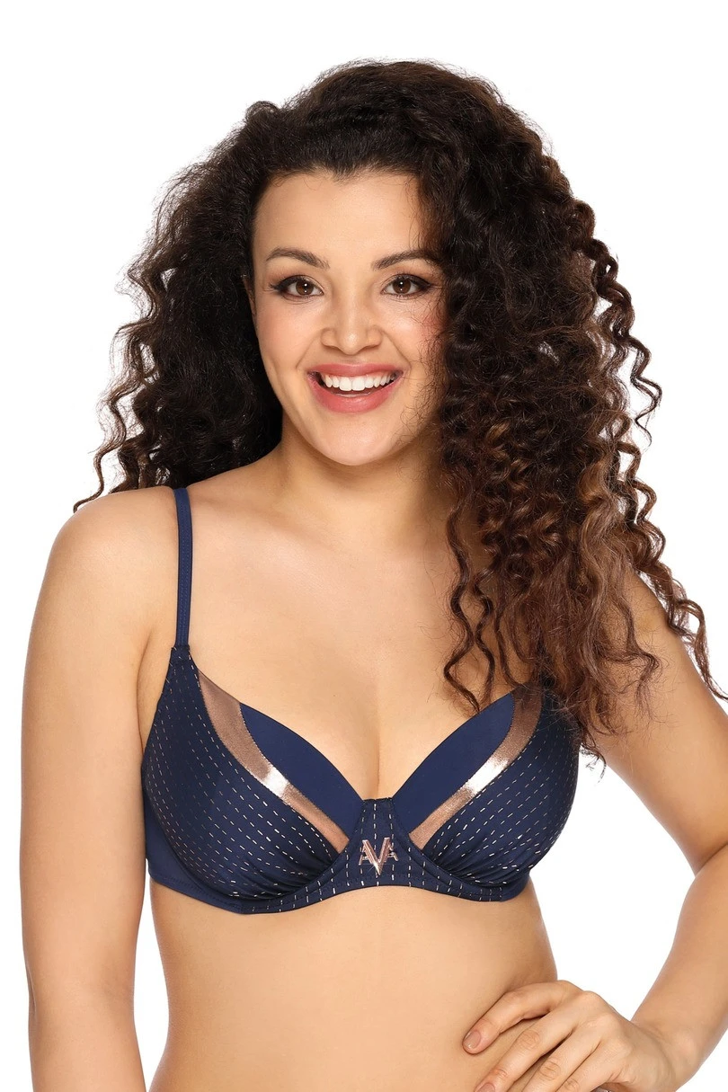 Podprsenka je vyrobená z velmi kvalitní tkaniny, která dokonale zahaluje a zvýrazňuje oblé tvary ženského těla. Lesklý potisk s měděným pruhem na inkoustově tmavě modrém pozadí uspokojí očekávaní i nejnáročnějších zákaznic. Díky vyztužení podprsenka ideálně stahuje poprsí ke středu hrudníku, nadnáší jej, poskytuje mu oporu a udržuje jej na správném a žádoucím místě.