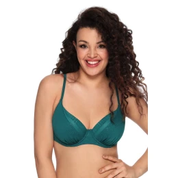 Podprsenka pěkně pojme i neforemné poprsí. Jemné nařasení ve spodní části košíčků zvýrazňuje poprsí. Spojení tří typů lesklých tkanin ve stejné barvě vytváří pěknou kompozici. Jemný rovnoměrný potisk připomínající stříbrné kapky dodává modelu výjimečný vzhled.