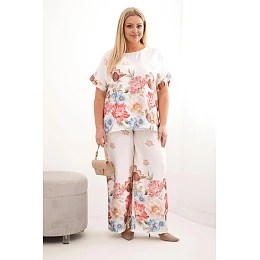 Dámská plus size souprava s halenkou a kalhotami s květinovým vzorem je vynikající volbou pro ženy, které si cení pohodlí, módního vzhledu a volnosti nošení každý den. Tento výjimečný komplet okouzlí efektním květinovým vzorem, který dodává celému modelu lehkost a ženský charakter. Volná halenka zajišťuje komfort a pěkně padne na postavu, zatímco dlouhé kalhoty s elastickým pasem zaručují pohodlí po celý den. Je to ideální volba jak na rodinná setkání, procházky, dovolenou, tak i na každodenní outfity v elegantnějším provedení.