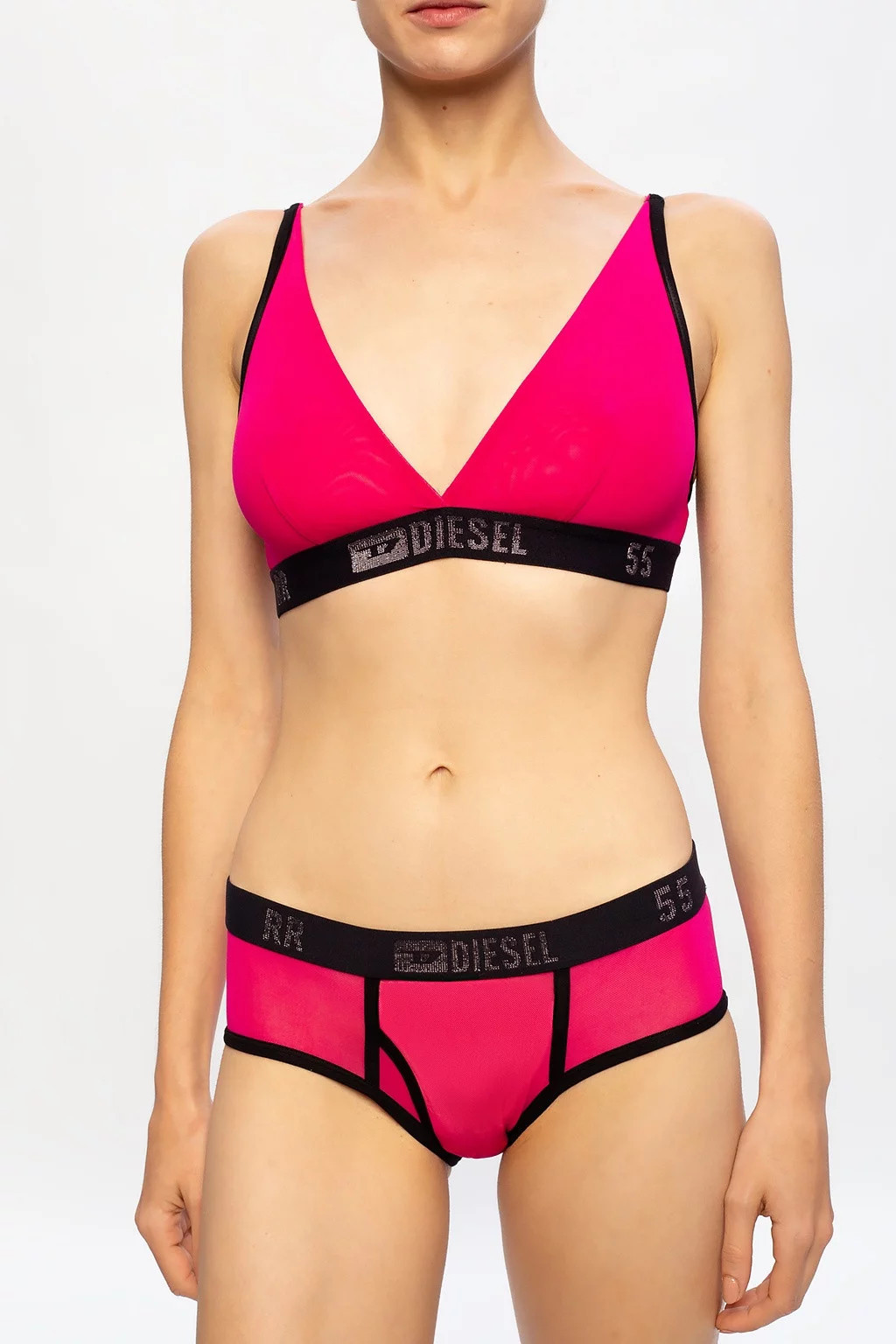 Růžová podprsenka značky Diesel. Tento kousek je zakončen nastavitelnými popruhy a elastickým páskem zdobeným logem vykládaným stříbrnou a lurexovou přízí.