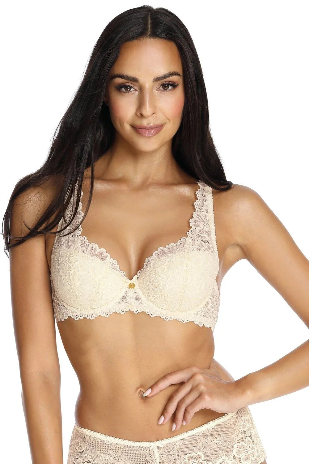 Dámská podprsenka 053/22 Carmela cream MAT - krémová barva - z krajky s květinovým motivem - vyztužená - vnitřní strana košíčků podšitá bavlnou - boční části s kosticí - nastavitelná a neodepínatelná krajková ramínka - nadzvedává a přidržuje poprsí