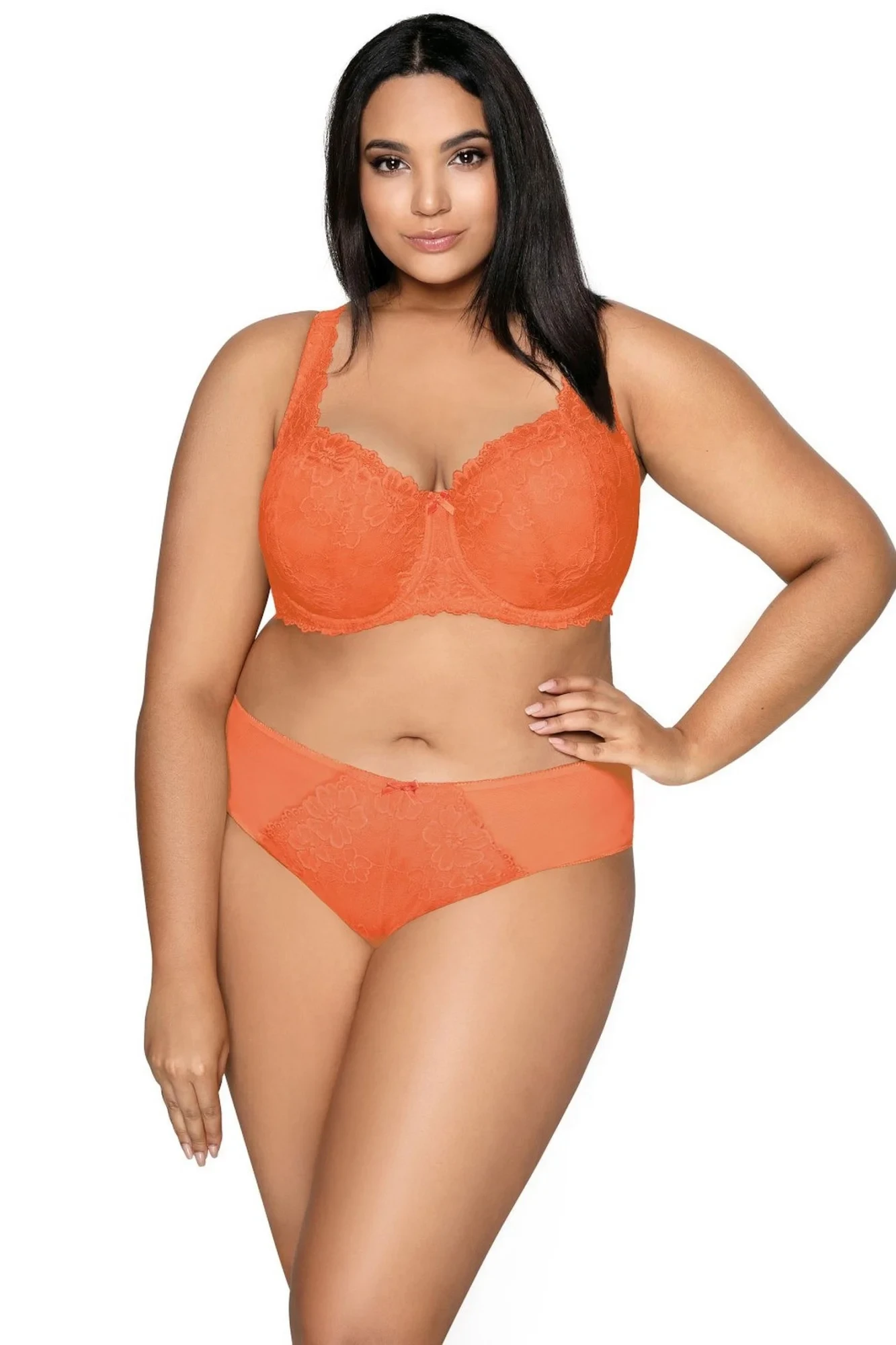 Dámská podprsenka 053/22 Carmela orange plus MAT - oranžová barva - z krajky s květinovým motivem - vyztužená - vnitřní strana košíčků podšitá bavlnou - boční části s kosticí - nastavitelná a neodepínatelná krajková ramínka - nadzvedává a přidržuje poprsíMateriálové složení: 44% polyamid + 18% polyester + 16% bavlna + 16% polyuretan + 6% elastan