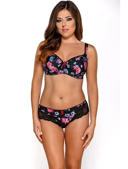 Dámská podprsenka typu Balkonetka ušitá z květované látky na černém pozadí. Klade důraz na ženské přednosti. Ramínka jsou nastavitelná, neodepínací. Možnost dokoupit do kompletu tanga a kalhotky.