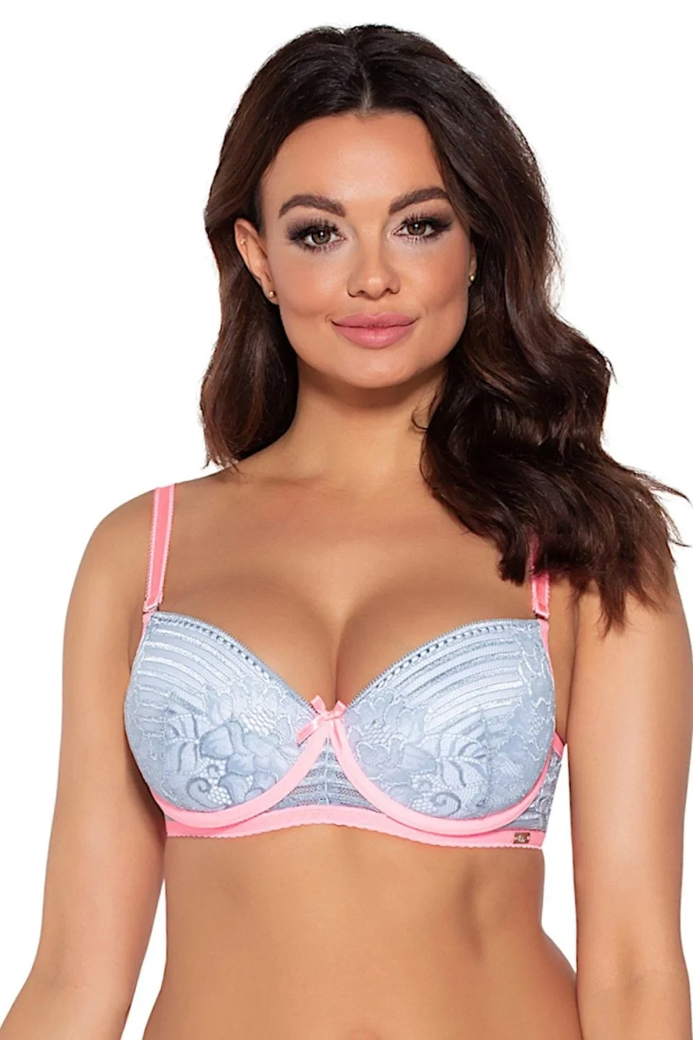Dámská podprsenka 2001 AVA - šedá barva - typ push up - kontrastní barvy - vyjímatelné vycpávky - zdobená krajkou - odepínatelná ramínka - zapínání na 2 háčky s dvou nebo třířadým nastavením