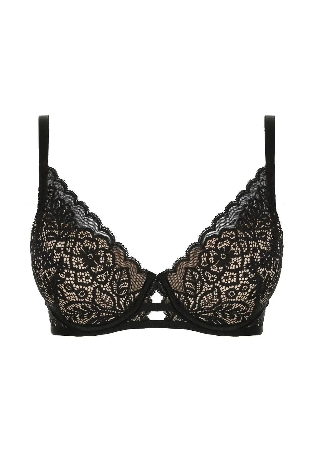 Dámská podprsenka 37369 Hint black HENDERSON - černá barva - push up košíčky - košíčky zdobené tylovou krajkou s květinovým motivem - vyjímatelné push up vycpávky - neodepínatelná ramínka - zapínání na dva háčky s třístupňovým zapínáním
