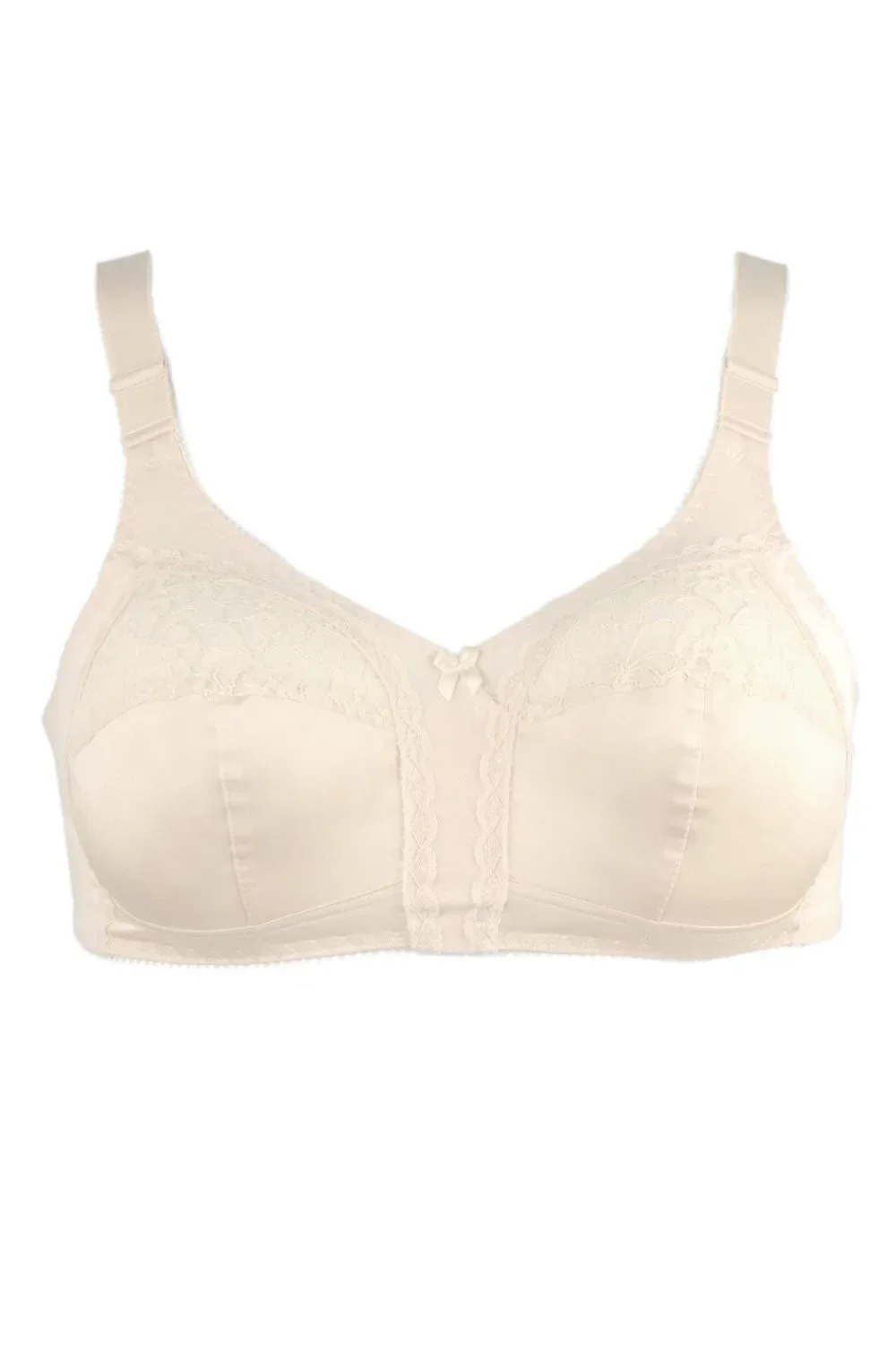Dámská podprsenka 577 Joanna beige plus VIKI - béžová barva - silnější ramínka - nevyztužené košíčky s kosticemi - netradiční střih - košíčky jsou zdobené jemnou krajkou - mezi košíčky decentní mašlička na ozdobuMateriálové složení: 78% polyamid +18% elastan + 4%bavlna