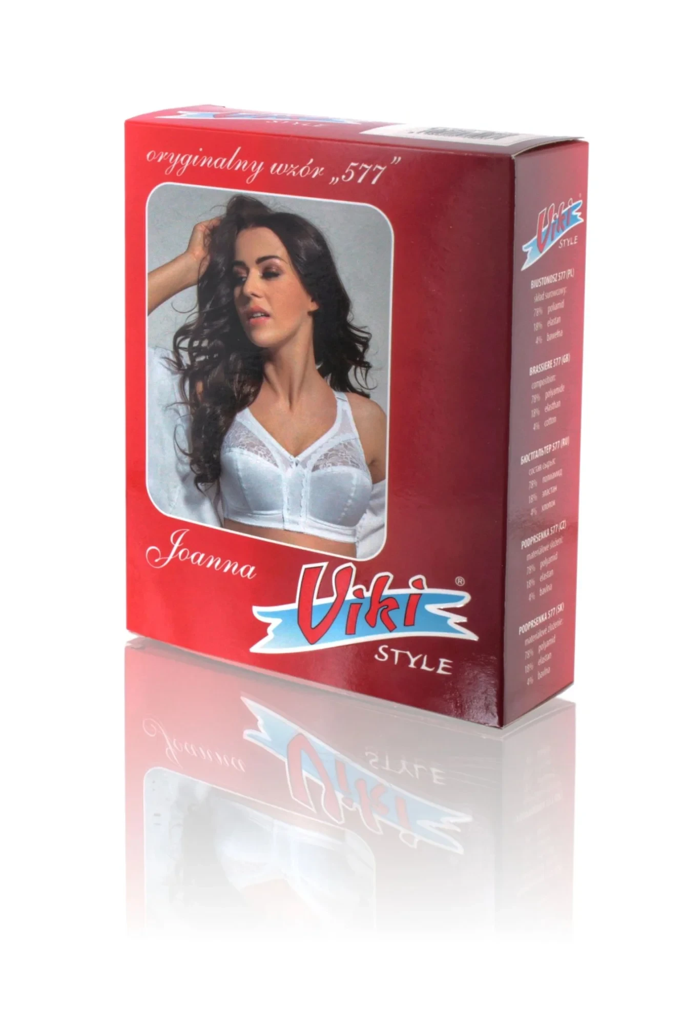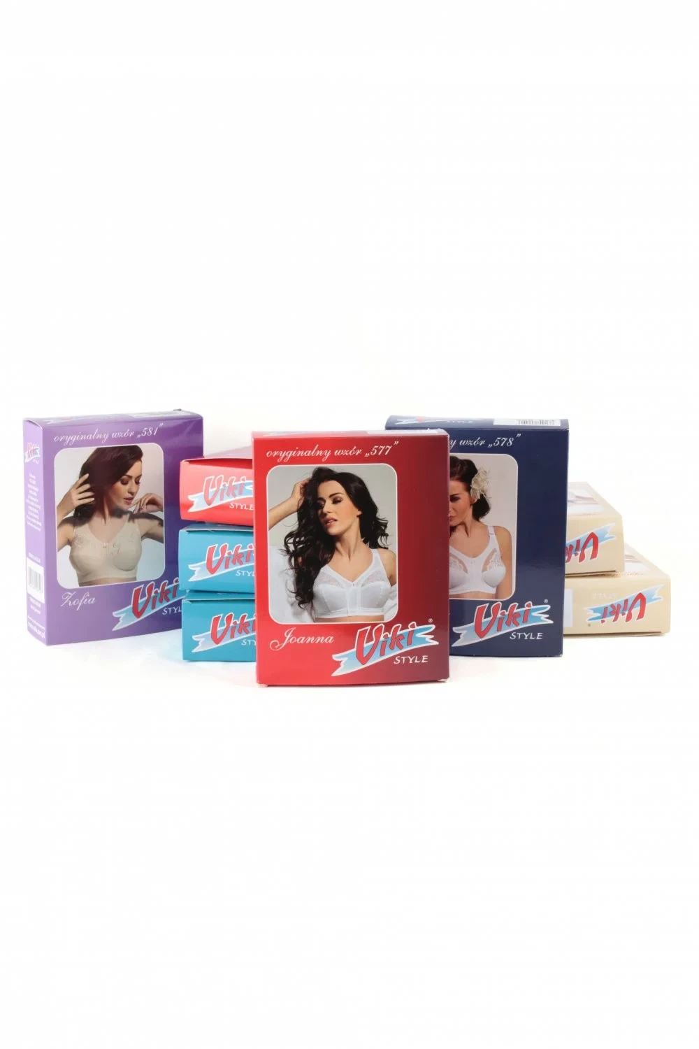 Dámská podprsenka 577 Viki - bílá barva - silnější ramínka - nevyztužené košíčky s kosticemi - netradiční střih - košíčky jsou zdobené jemnou krajkou - mezi košíčky decentní mašlička na ozdobu