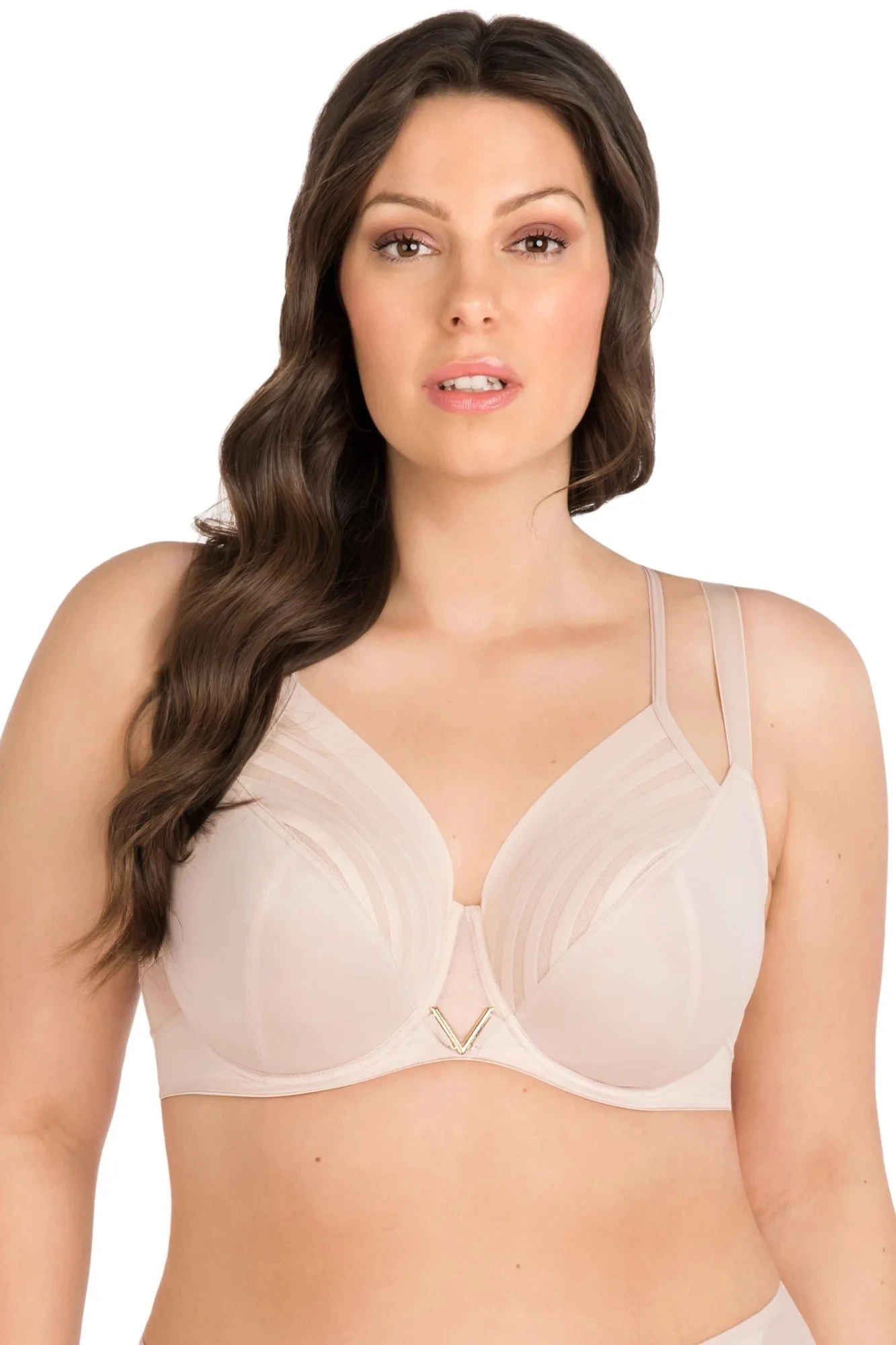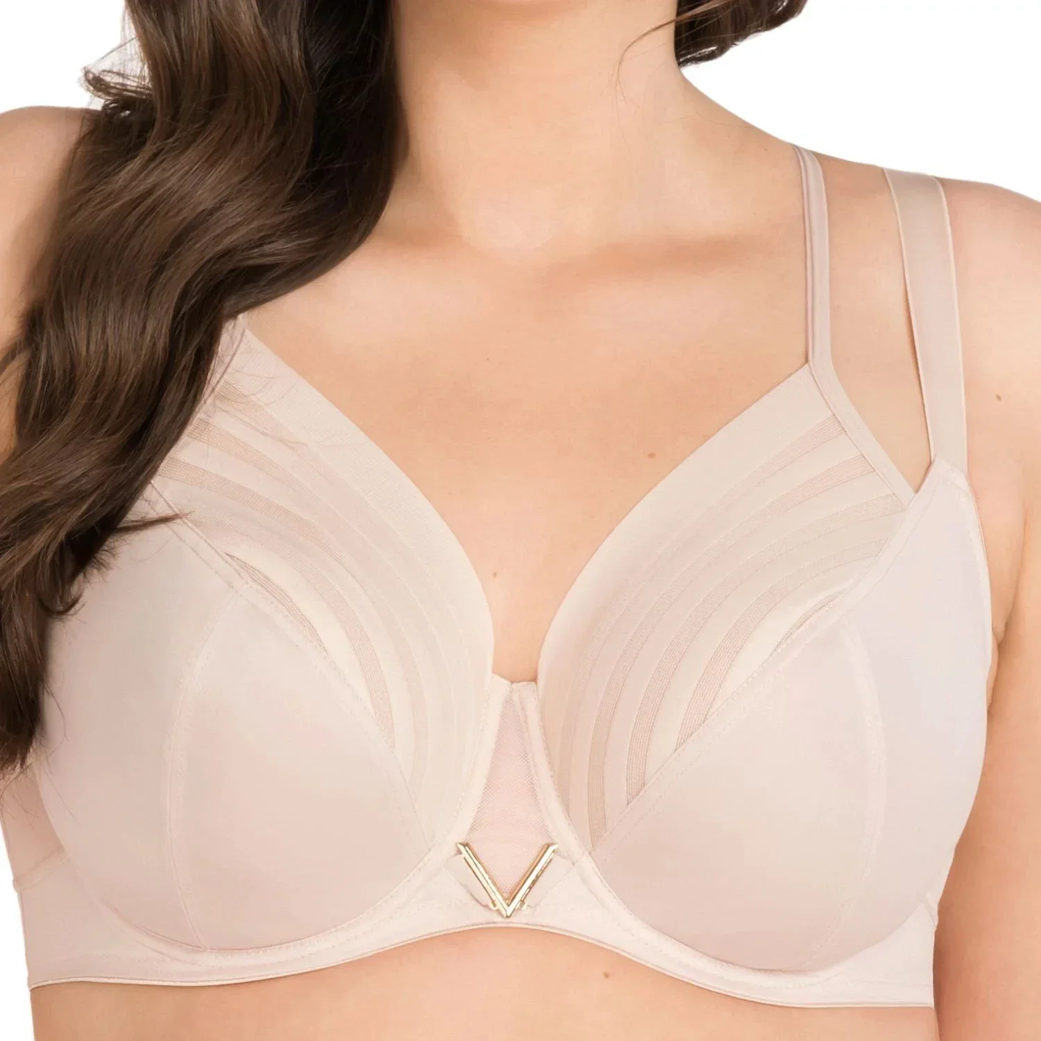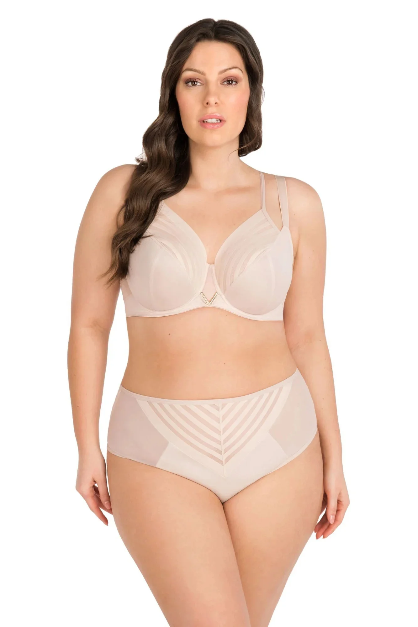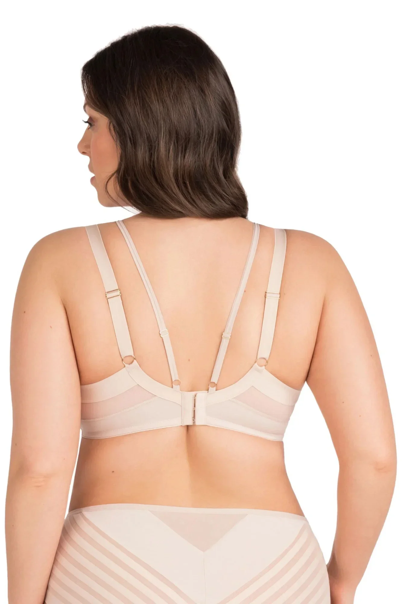 Dámská podprsenka 810 Yoko beige GORSENIA - béžová barva - měkká podprsenka - s kosticemi - z lesklé látky a síťoviny s proužkovým motivem - obvod z elastické látky a průhledného tylu - dvojitá ramínka nastavitelná a neodepínatelná