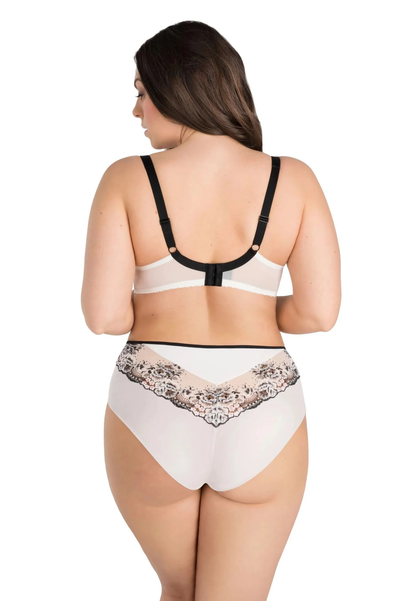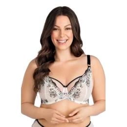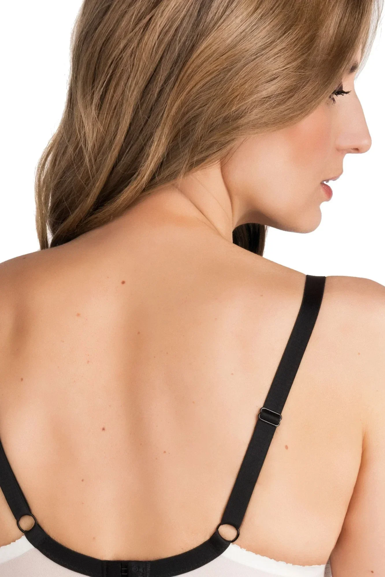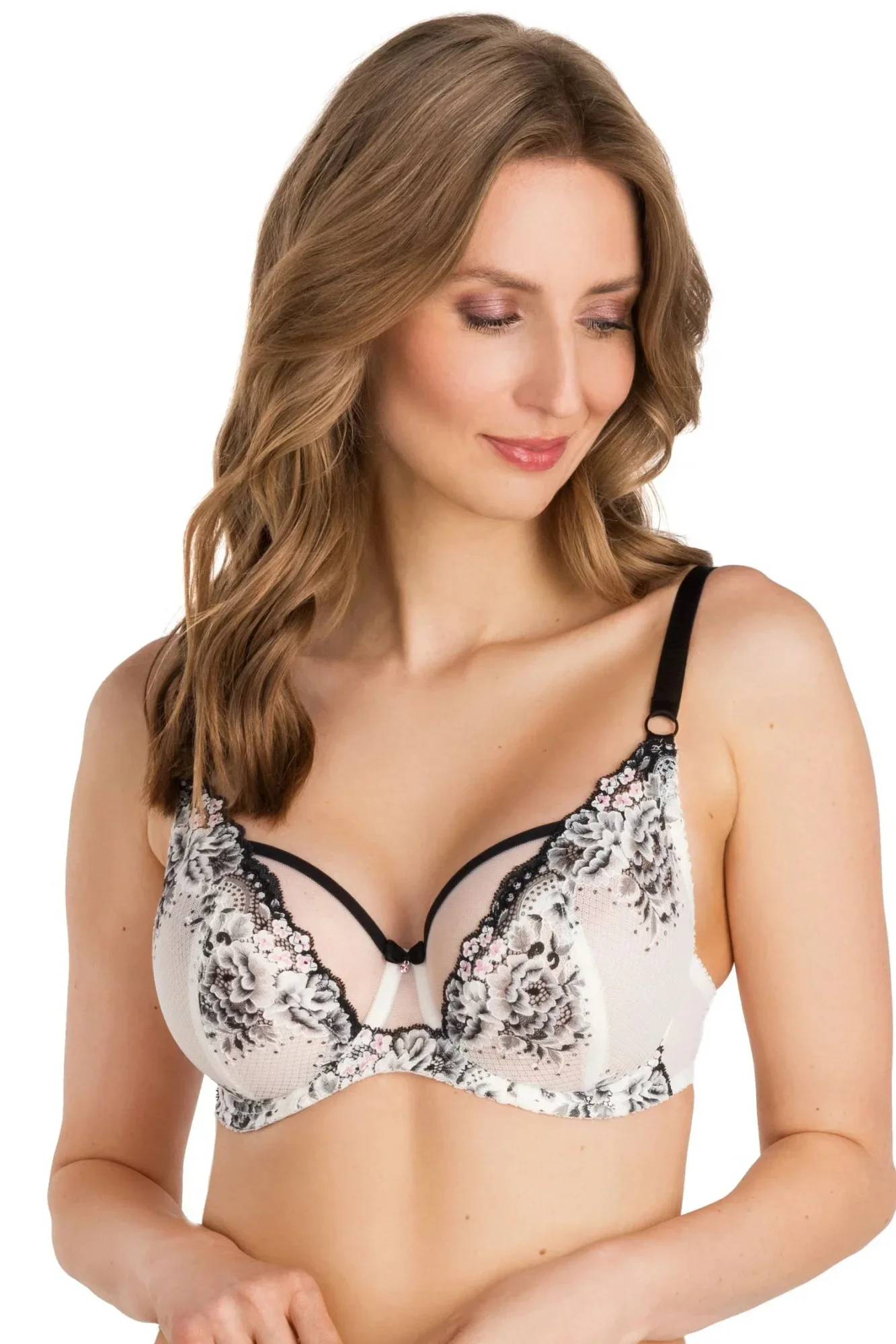 Dámská podprsenka 840 Black & white GORSENIA - bílá barva - typ soft - měkká podprsenka s kosticemi - košíčky zdobené krajkou s květinovým motivem - poskytuje efekt silného zvedání - boky ze stabilní síťoviny, bez boční kostice - pro ženy se středním a velkým poprsím - nastavitelná a neodepínatelná ramínka (větší velikosti vyztužené sametovou páskou) - zapínání na dva nebo tři háčky se čtyřstupňovým nastavením