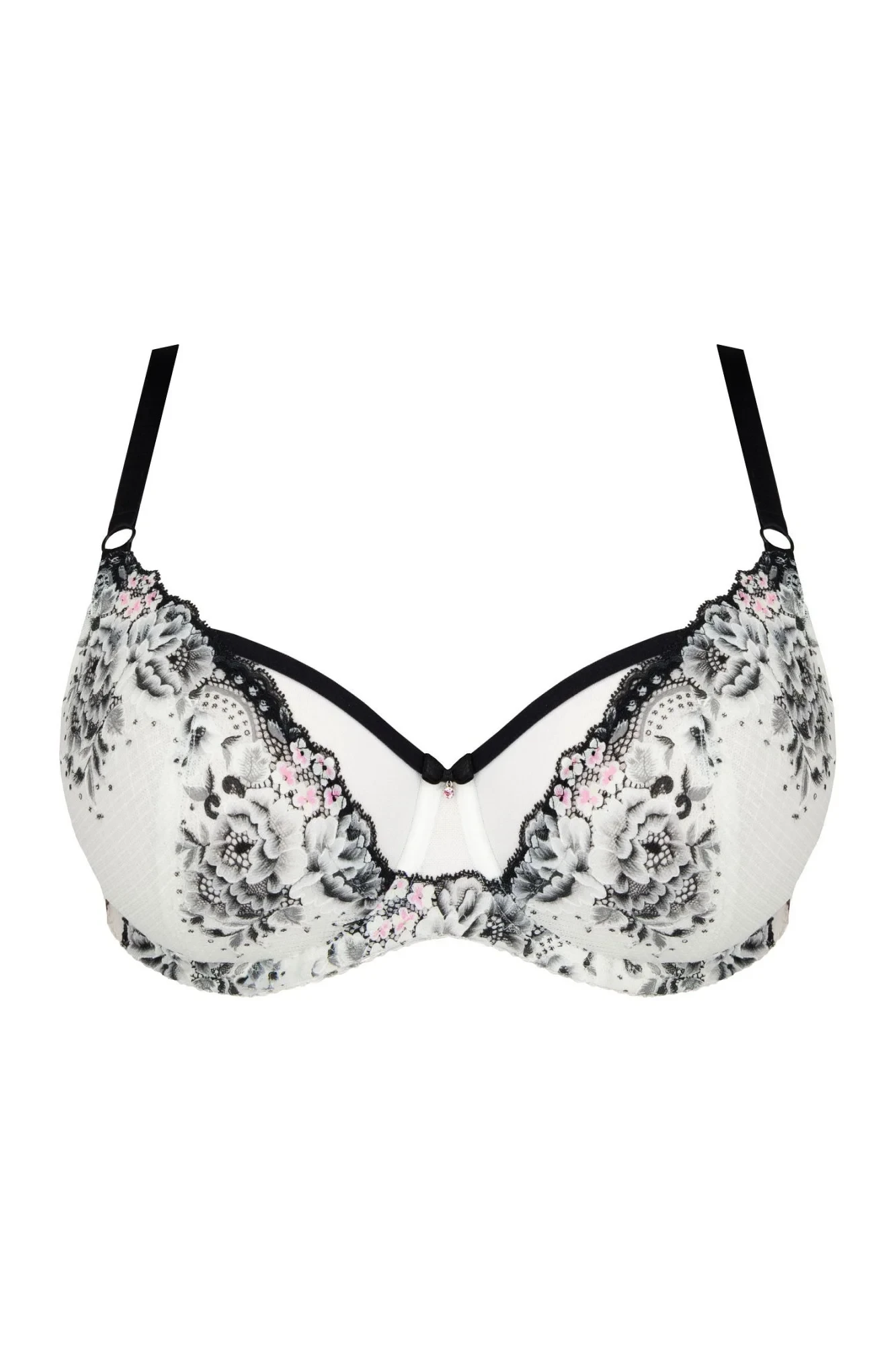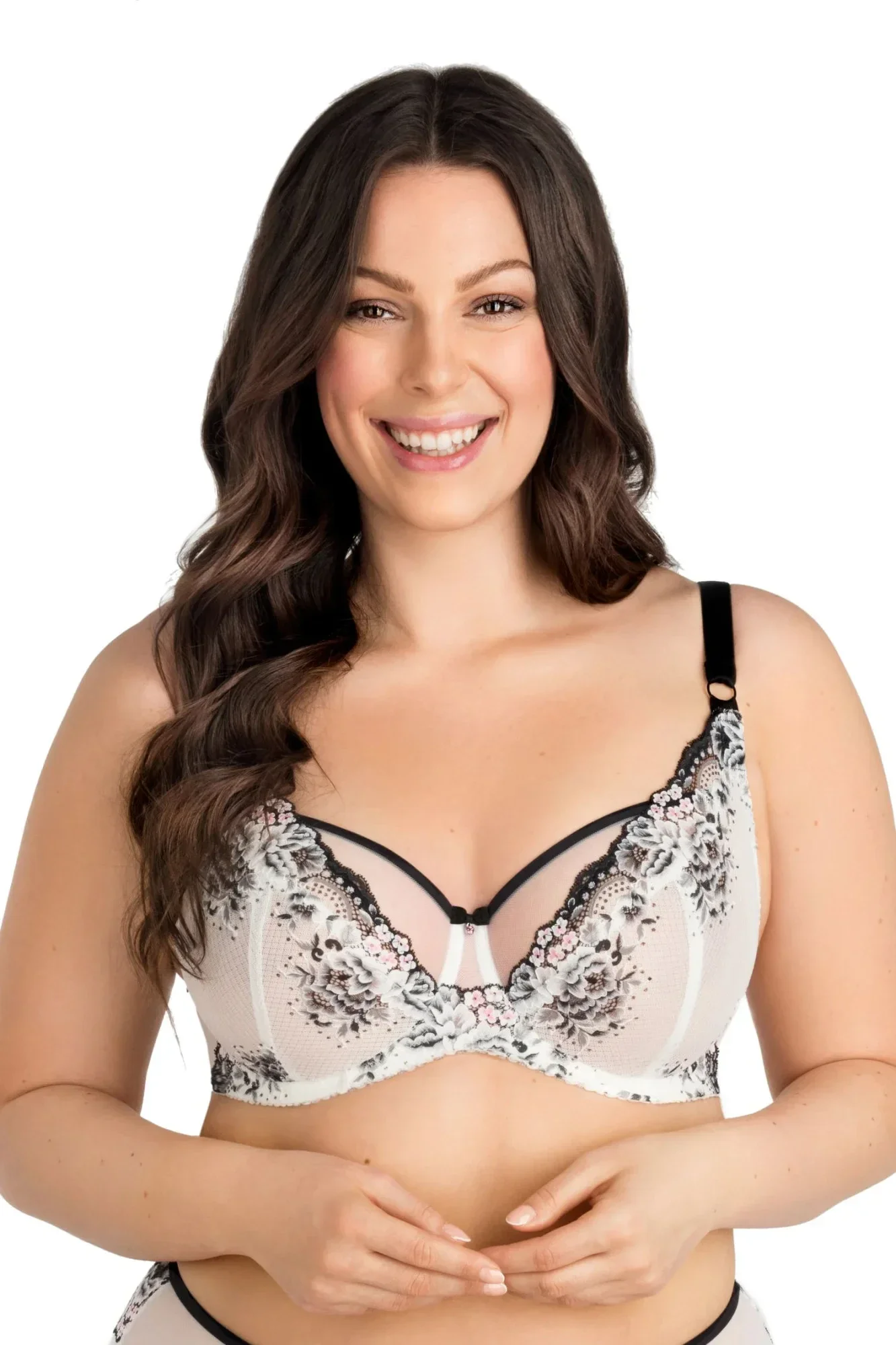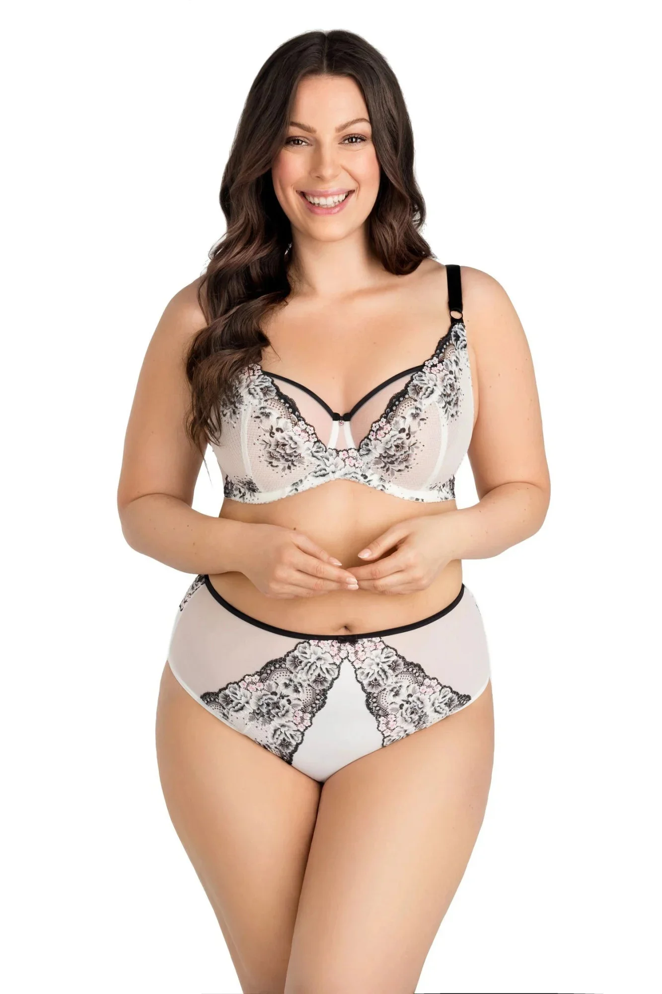 Dámská podprsenka 840 Black & white GORSENIA - bílá barva - typ soft - měkká podprsenka s kosticemi - košíčky zdobené krajkou s květinovým motivem - poskytuje efekt silného zvedání - boky ze stabilní síťoviny, bez boční kostice - pro ženy se středním a velkým poprsím - nastavitelná a neodepínatelná ramínka (větší velikosti vyztužené sametovou páskou) - zapínání na dva nebo tři háčky se čtyřstupňovým nastavením