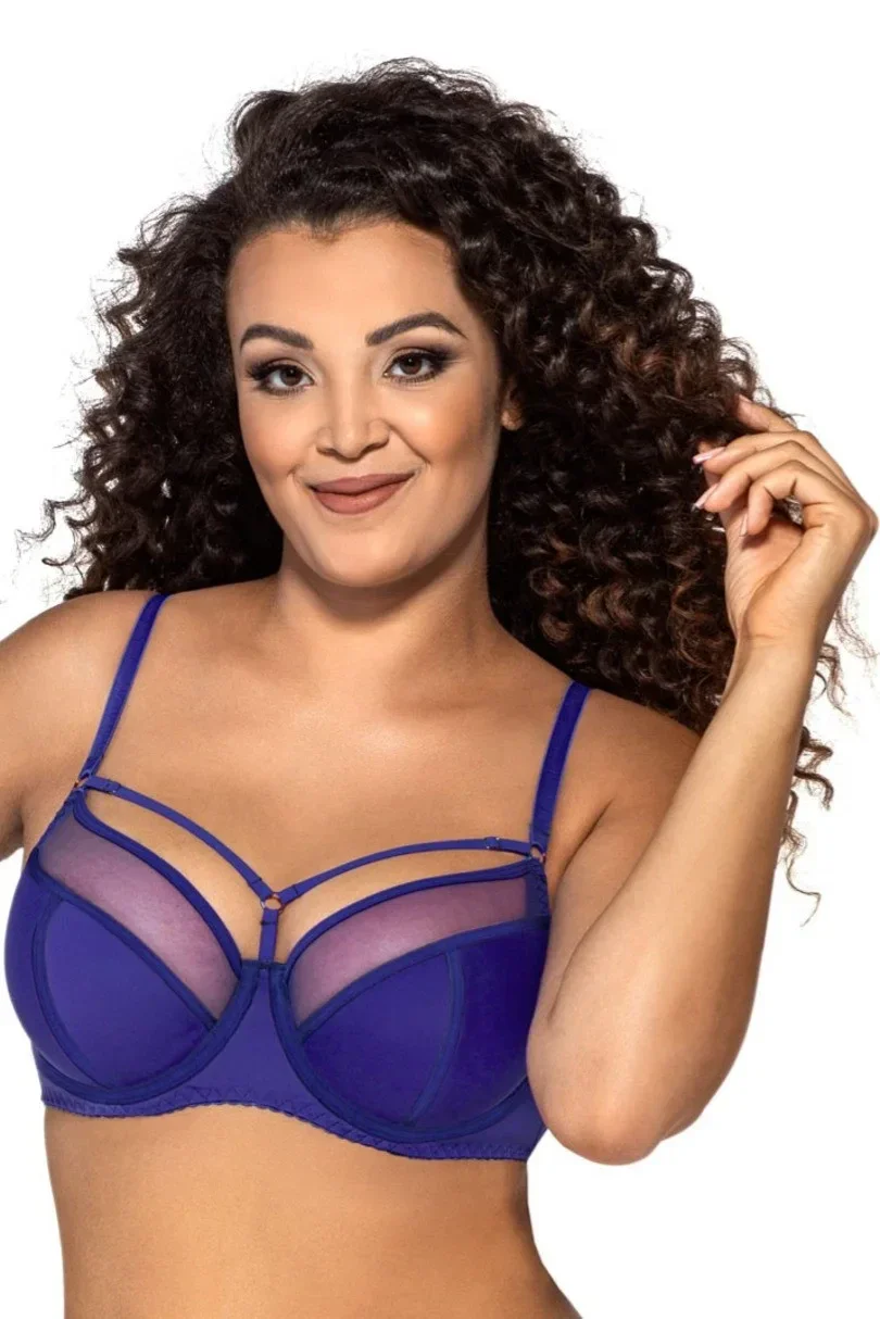 Tato svůdná dámská podprsenka v netypických barvách vás okouzlí dokonalým střihem, konstrukcí a pěkným vzhledem. Polovyztužené košíčky jsou vyrobené z tylu v hluboké fialové barvě a z pružné tkaniny, která je uvnitř vyztužená měkkou pěnou. Díky tomu a díky pružnému obvodu model nadnáší poprsí a poskytuje maximální pohodlí a komfort při nošení. Ve vrchní části košíčků jsou lesklé saténové pásky s barevným švem, které dodávají podprsence styl. Pružné pásky nad poprsím zvýrazňují oblé tvary poprsí.
