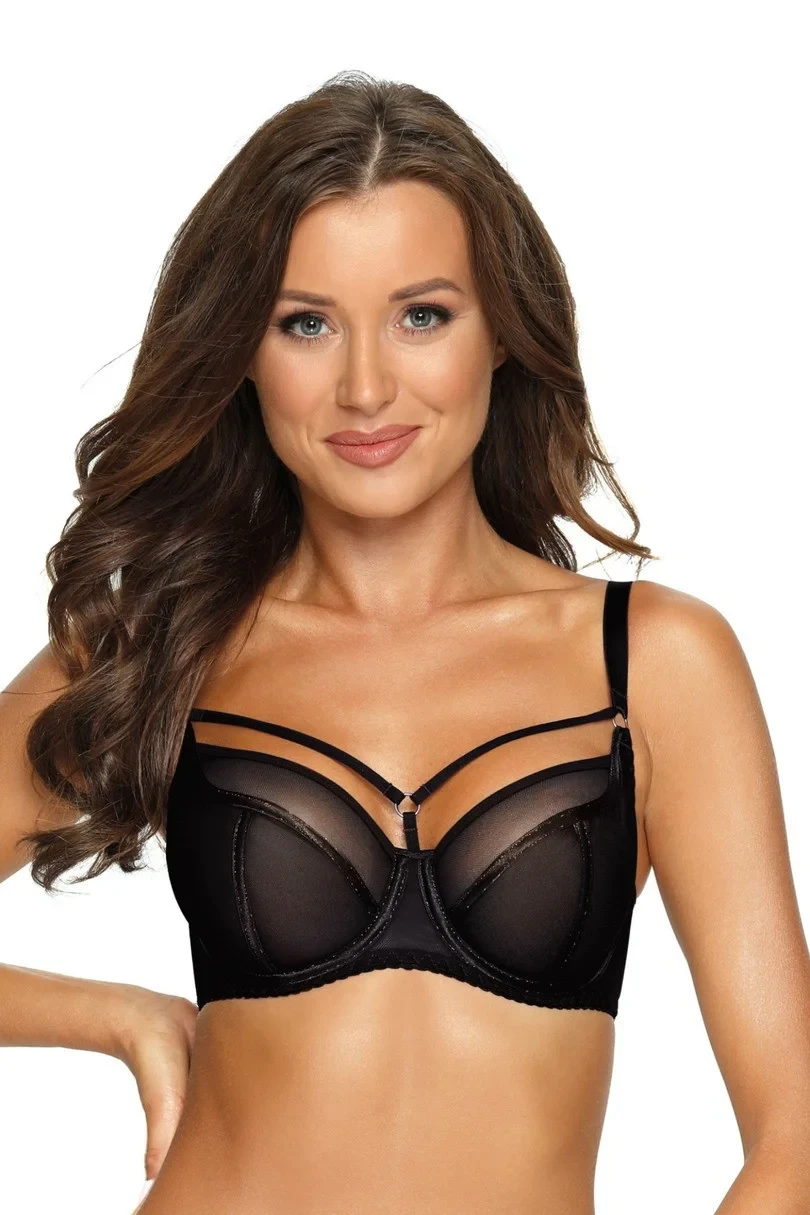 Jemný sněhobílý tyl krásně obepíná poprsí. Tyl je ozdobený saténovými páskami obšitými lesklou barevnou přízí. Košíčky pěkně tvarují poprsí a dodávají jim oblý tvar. Pružný obvod udržuje podprsenku na sprvném a žádoucím místě. Dekorační pásky v dekoltu spolu s kovovými vícebarevnými kolečky zvýrazňují všechny vaše přednosti a zdobí dekolt.