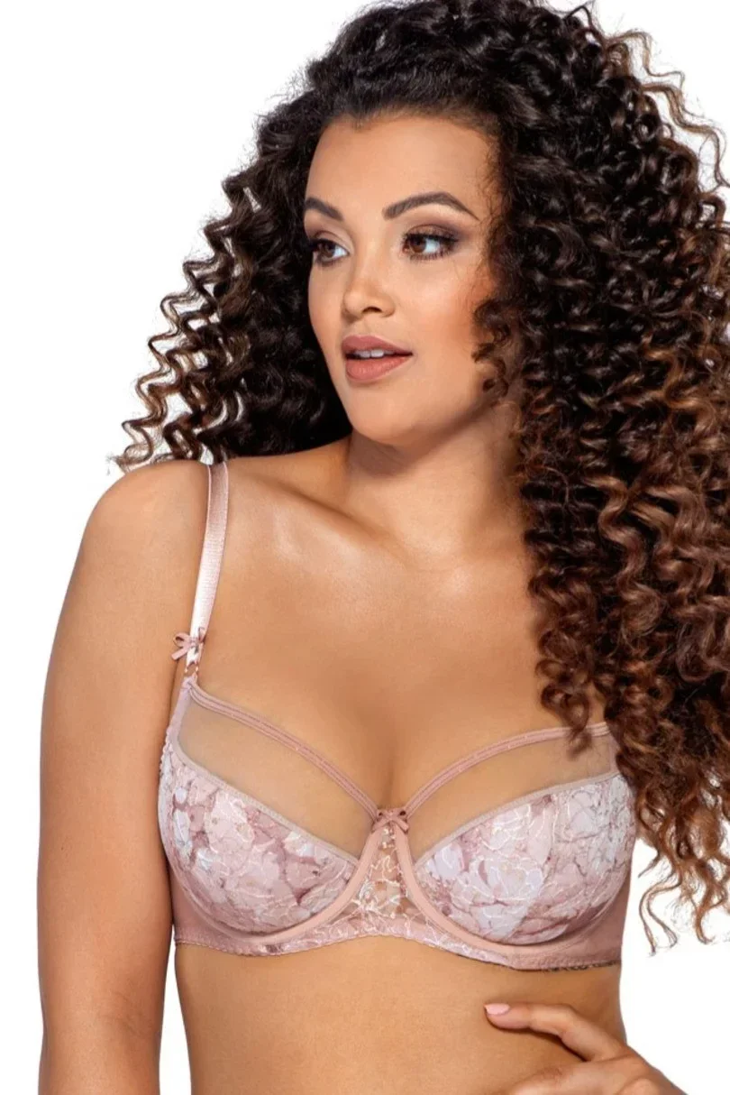 Košíčky podprsenky jsou ve spodní části vyztužené měkkou pěnou, která perfektně obepíná a nadnáší poprsí. Košíčky spolu s pružným obvodem udržují poprsí na správném a žádoucím místě. Vrchní část košíčků pokrývá jemný tělový tyl, který je ve vrchní části transparentní a ve spodní části je ozdobený vyšívanými květy. Pudrově růžové barevné provedení zdobí stínování a rozjasňují lesklé příze. Mašličky dodávají modelu AV 1981 dívčí půvab.