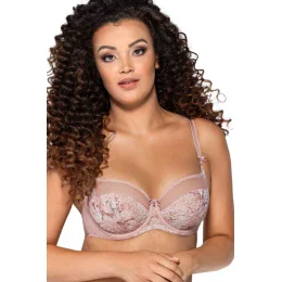 Tato měkká dámská podprsenka typu "soft" je ušitá z nejkvalitnějších materiálů. Obvod tvoří pružná tkanina, která ideálně přiléhá k tělu. Tylový můstek a košíčky s bočním panelem jemně obepínají poprsí a dovolují kůži dýchat. Úchvatná květinová výšivka, která je bohatě zdobená zlatou a perleťovou přízí na vystínovaném měkkém tylu, dodává celému modelu lehkost, smyslnost a grácii.