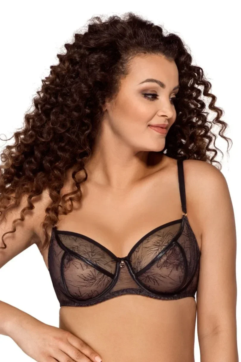 Podprsenka má střih a konstrukci typu K-1391. Tato klasická dámská podprsenka se určitě musí stát součástí vašeho šatníku. Měkké košíčky jsou vyrobené ze vzorovaného černého materiálu, který je ve spodní části podšitý tělovým materiálem. Díky tomu model pěkně nadnáší poprsí a dodává mu oblý tvar. Saténové pásky, které křižují košíčky, dodávají celému modelu na půvabu, podobně jako lesklá ozdoba v místě spojení košíčků.