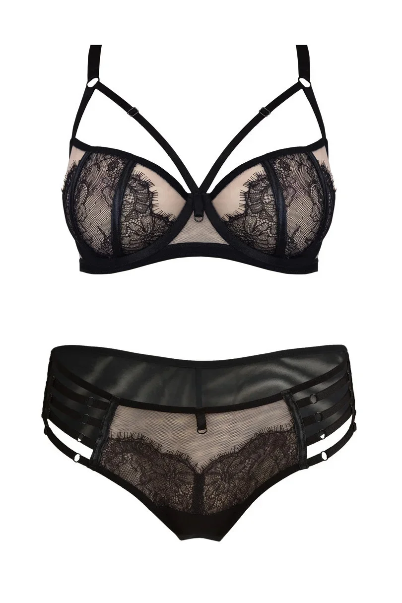 Košíčky jsou vyrobené ze síťoviny v barvě mokka, na kterou je našitá krajka. Černé lemovky překrývají svislé švy. Střih a konstrukce modelu dokonale zvýrazňují poprsí a ozdobné pásky půvabně zdobí dekolt.