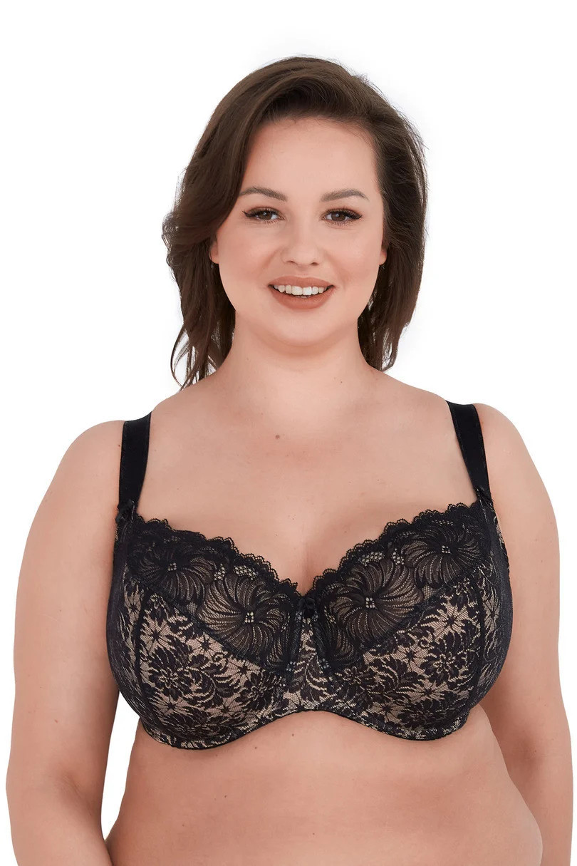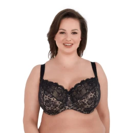 Celý košíček je vyroben z nápadné černé krajky s květinovým vzorem, která prádlu dodává výjimečný půvab a smyslnost. Spodní část košíčků je podšitá elastickým úpletem a vnitřní strana je zakončena jemnou bavlnou, která je šetrná k citlivé pokožce. Boční velrybí kostice zabraňují sjíždění materiálu a zvyšují komfort nošení. Široká, nastavitelná ramínka dokonale podpírají poprsí, aniž by tlačila.