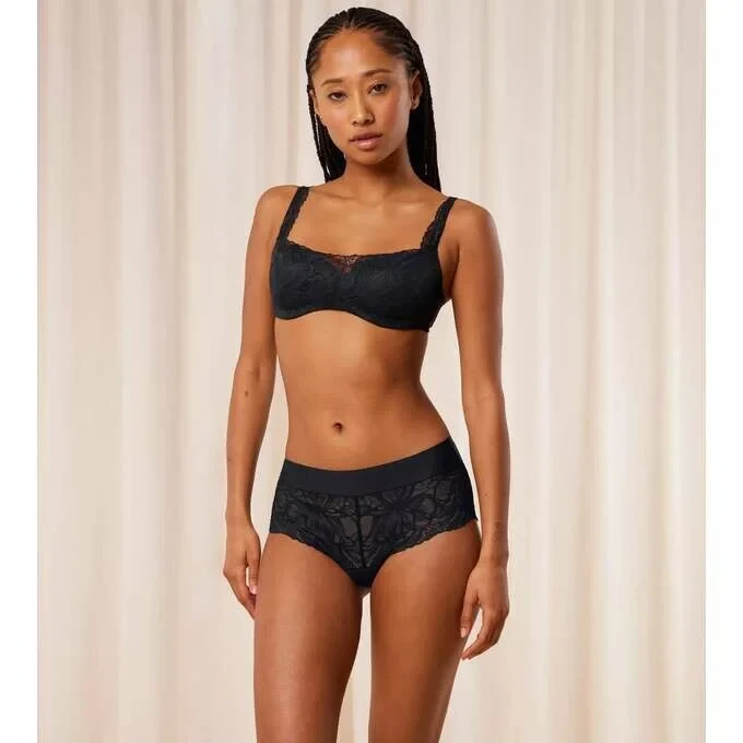 Kombinace hladké krajky a měkkého mikrovlákna se sametovým omakem a vyraženým logem značky.