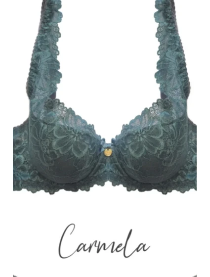 Usztywniany biustonosz z koronki o kwiatowym motywie typu semi soft. Wewnętrzna strona miski podszyta bawełną. Boki wzmocnione pionową fiszbiną. Ozdobne, regulowane ramiączka, nieodpinane. Model idealnie unosi i podtrzymuje biust.