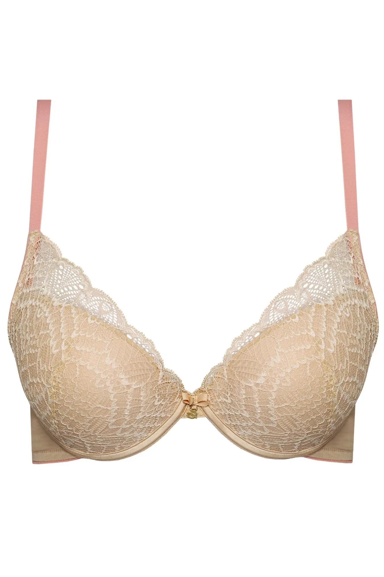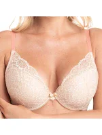 Dámská podprsenka Charlotte A479 beige Samanta - béžová barva - z krajky s prolamovaným ornamentálním motivem - košíčky z tepelně profilované pěny s push up výplní - mezi košíčky mašlička - obvod z krajky a elastického tylu - krajkové zdobení na zádech - nastavitelná a neodpínatelná ramínka - zapínání, kroužky a regulátory ve zlaté barvě - zapínání na dvouřadé háčky s třístupňovým nastavením - certifikát Oeko-Tex STANDARD 100®