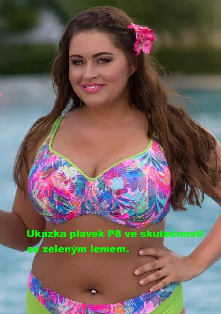Dámská plavková podprsenka značky Fantasy. Podprsenka má push-up výztuž, pestrobarevné zbarvení lemuje výrazný zelený lem. Ramínka se dají odepnout a lze ji nosit jako korzetovou podprsenku. Vzadu je na kovové zapínání. Plavky jsou české výroby.