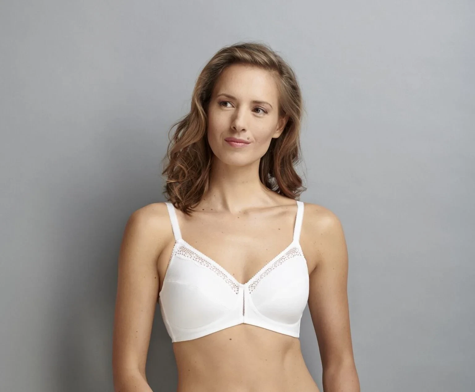 Podprsenka s měkkými košíčky, ušitá z příjemné bavlny. Ramínka jsou jemně zdobená, regulovatelná. Model se zapíná vzadu na háčky s regulací šířky.