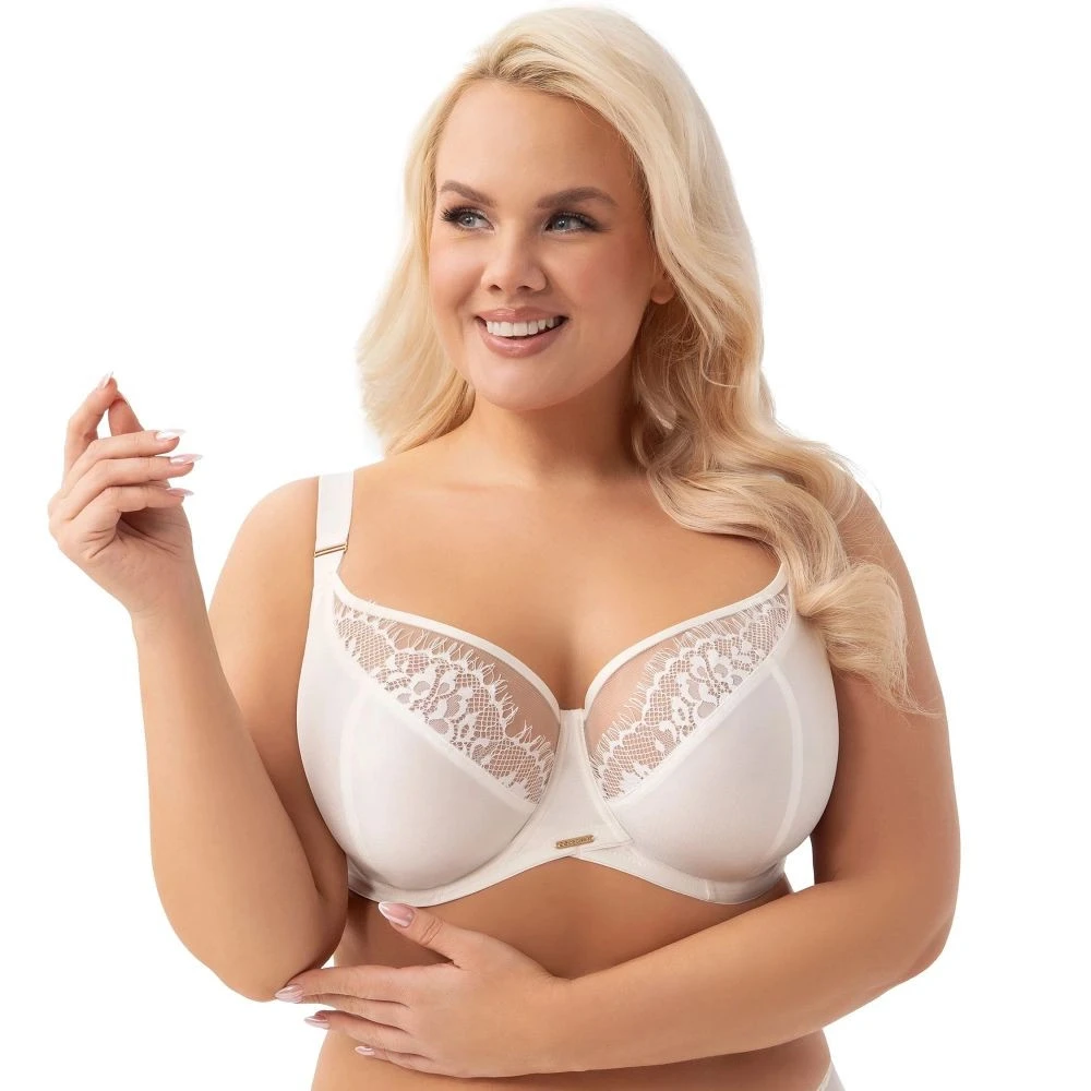 Dámská podprsenka 937 Evia cream GORSENIA - krémová barva - typ soft - třídílné košíčky zdobené krajkou - s kosticemi - široké boky z hladké lycrové látky - nastavitelná a neodepínací ramínka - zapínání na dva nebo tři háčky s trojí možností nastavení obvodu
