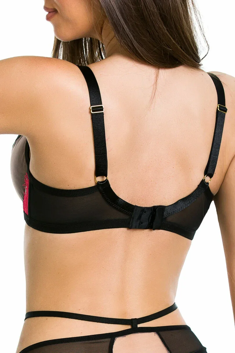 Spodní část košíčků je vyrobená ze síťoviny v barvě mokka. V horní části košíčků je našitá červená krajka. Dekolt zdobí pásky, které je možné nastavit i odepnout. Stabilní obvod modelu dokonale nadnáší poprsí.