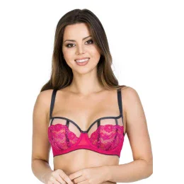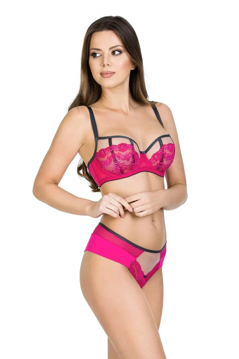 Košíčky jsou vyrobené ze síťoviny, na kterou je našitá krajka v amarantové barvě. Lemovky v grafitové barvě překrývají svislé švy. Model dokonale zvýrazňuje poprsí.
