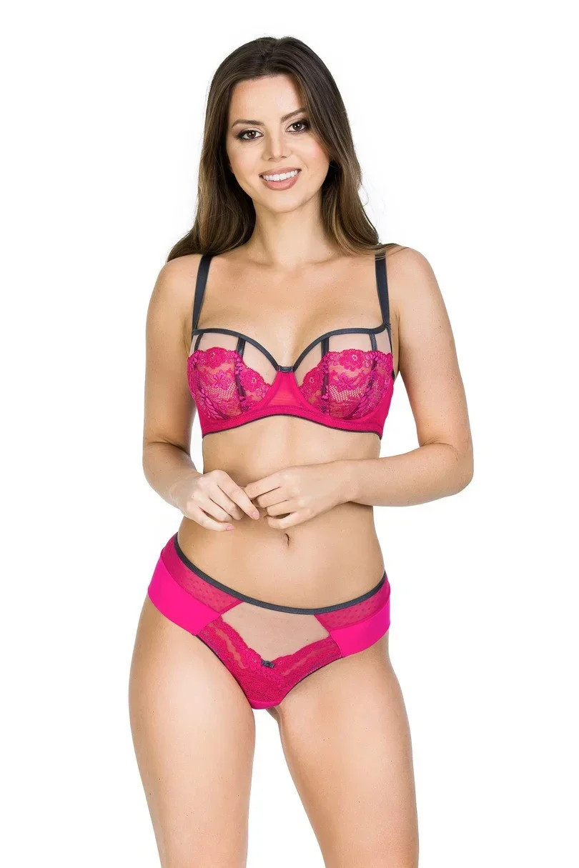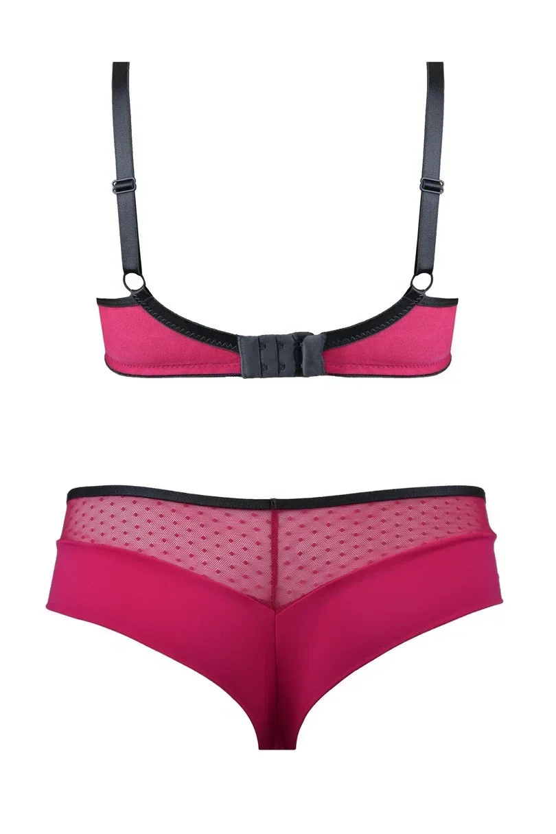 Košíčky jsou vyrobené ze síťoviny, na kterou je našitá krajka v amarantové barvě. Lemovky v grafitové barvě překrývají svislé švy. Model dokonale zvýrazňuje poprsí.