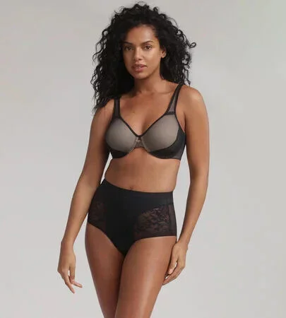 Dámská podprsenka v tělové barvě, potažená černým tylem, na spodní části košíčků našitá luxusní krajka. Ramínka jsou posouvací, zapínaní je na zádech na dva háčky.