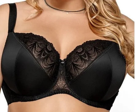 Podprsenka Casablanca K425 ze základní kolekce značky Gorsenia. Vyrobena z kombinace pevné, hladké tkaniny a krajky. Měkká konstrukce, s podšitím (boční i spodní část). Ramínka bez ramínek přizpůsobená velikosti podprsenky. Střed s mašličkou zdobenou zirkony. 90 % polyamid, 7 % elastan, 3 % polyester.