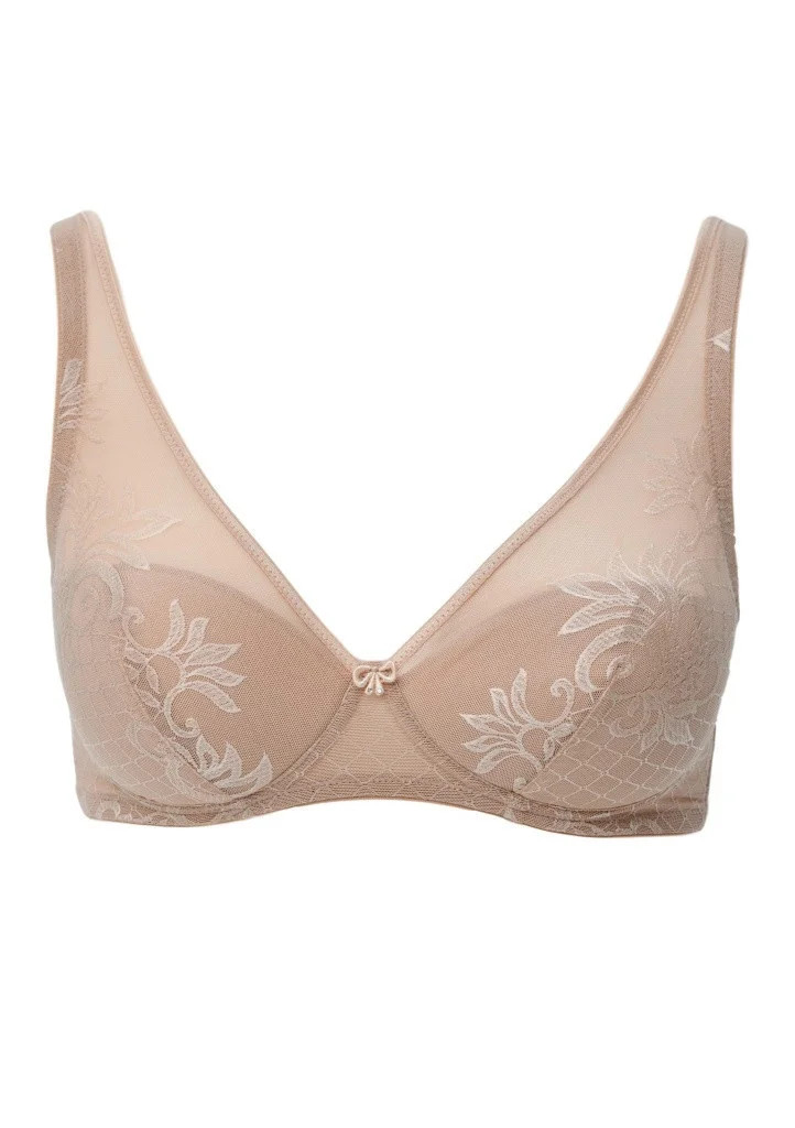 Dámská luxusní braletka od italské značky Leilieve. Podprsenka je bezkosticová, má hladké košíčky, které jsou potaženy dokonale jemnou krajkou sahající až k ramenům. Kraječka se nerýsuje pod oblečením. Obvod podrsenky je taktéž krajkový. Košíčky jsou lehce vyztuženy. Mezi košíčkami je malá ozdůbka se štrasovými kamínky. Pevně všitá ramínka jsou lehce délkově nastavitelná a mají kovové stříbrné spony. Zadní zapínání je na dva háčky a čtyři pozice.