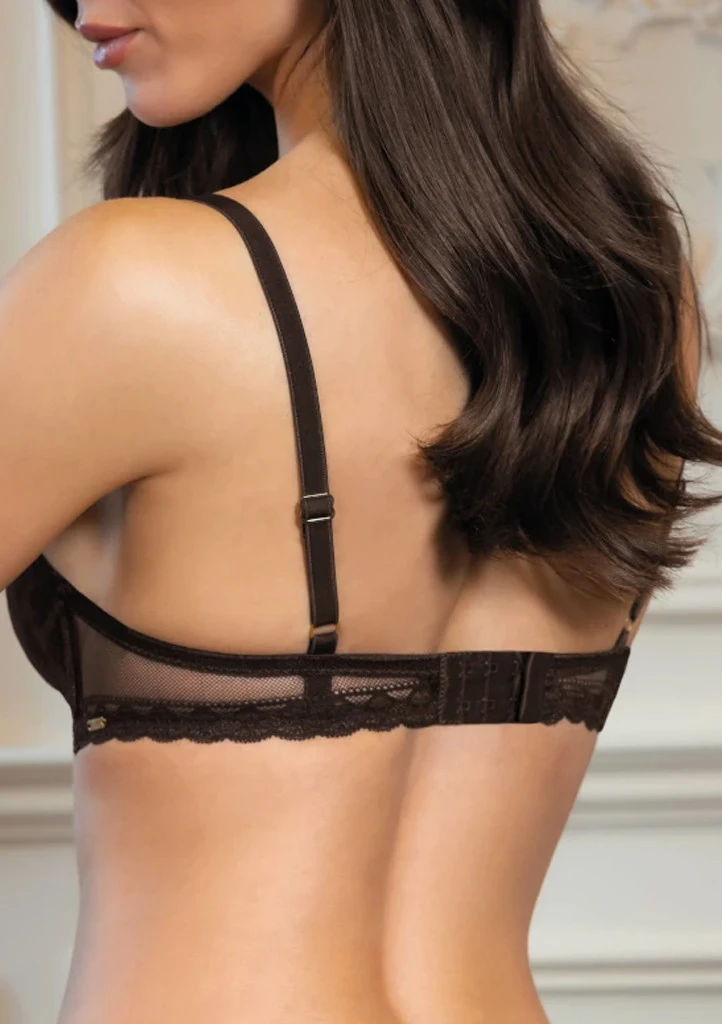 Dámská podprsenka v elegantním střihu bez kostic, která kombinuje pohodlí a svůdnost. Košíčky jsou lehce vyztužené a potažené jemným tylem s decentním motivem listů. Uprostřed mezi košíčky je ozdobný proužek se zlatým detailem, který dodává podprsence originální vzhled. Zadní díl tvoří pružná krajka se zapínáním na háčky. Ramínka jsou délkově nastavitelná.