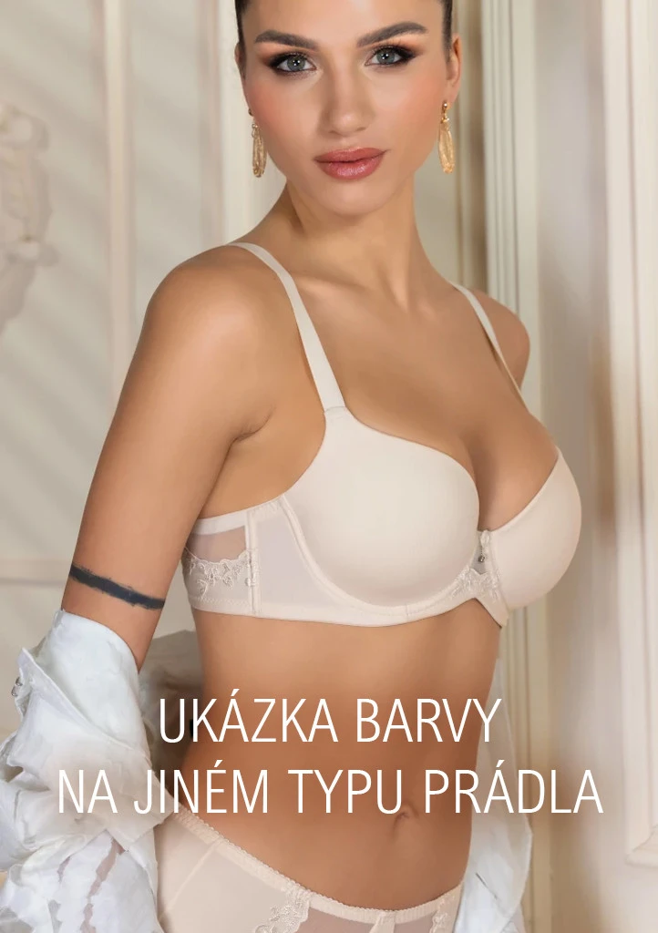 Podprsenka Leilieve v elegantním smetanovém odstínu zaujme svým jemným a ženským designem. Hladké, vyztužené košíčky s kosticí zajišťují přirozeně kulatý tvar a perfektní podporu. Boky podprsenky zdobí jemná krajka s decentní výšivkou na průhledném tylu, která dodává modelu nádech luxusu. Mezi košíčky je drobná ozdoba s kamínkem. Ramínka jsou nastavitelná, zapínání vzadu na háčky.