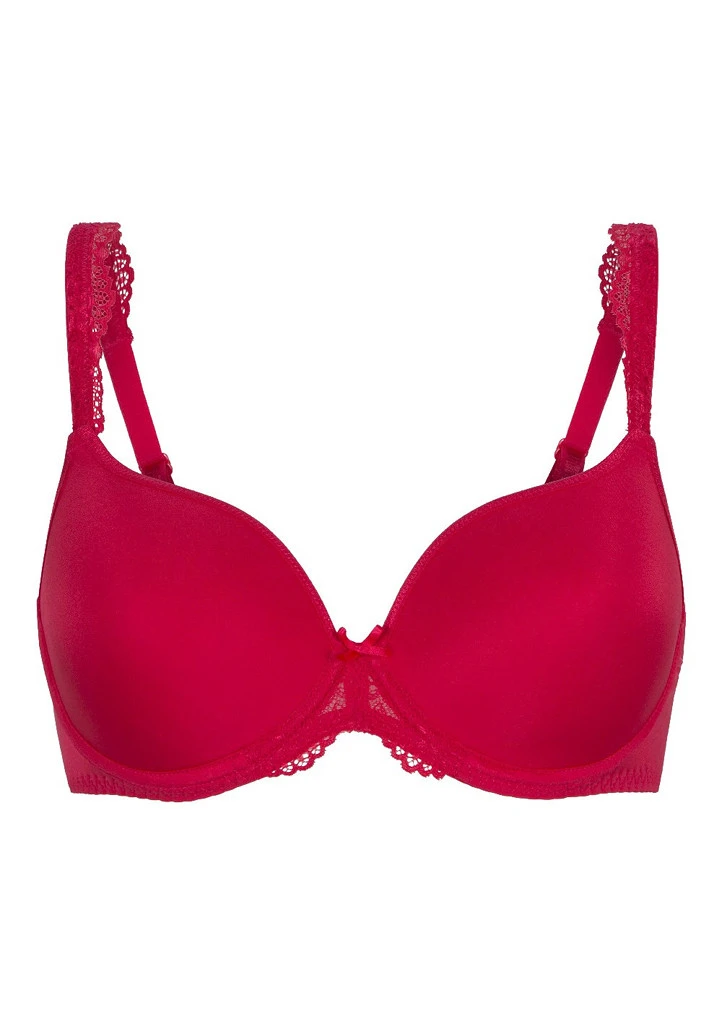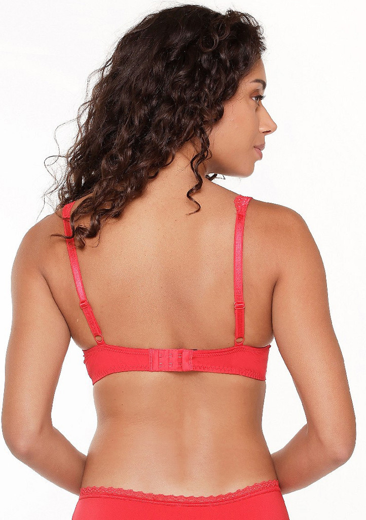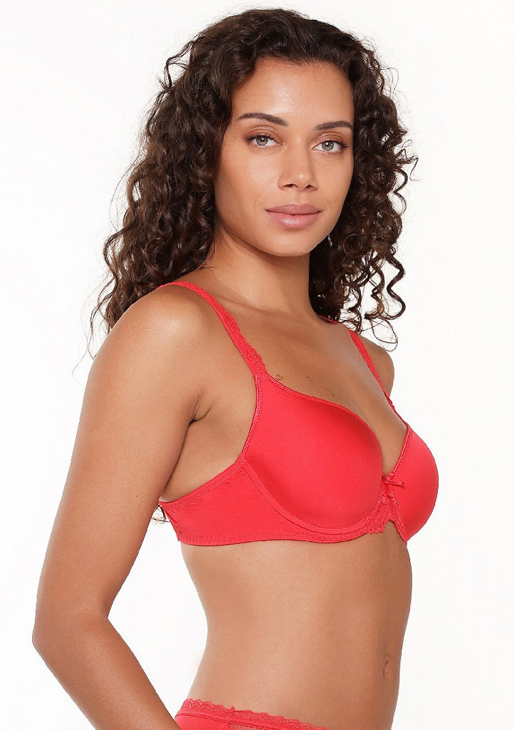 Dámská hladká podprsenka značky LingaDore v krásné červené barvě. Podprsenka má hladké košíčky s jemnou výztuží. Ve středu dekoltu je aplikována jemná krajka v kombinaci se saténovou mašličkou. Ramínka podprsenky jsou zdobena krajkou. Obvod podprsenky je hladký a má zapínání na dva háčky a tři pozice.