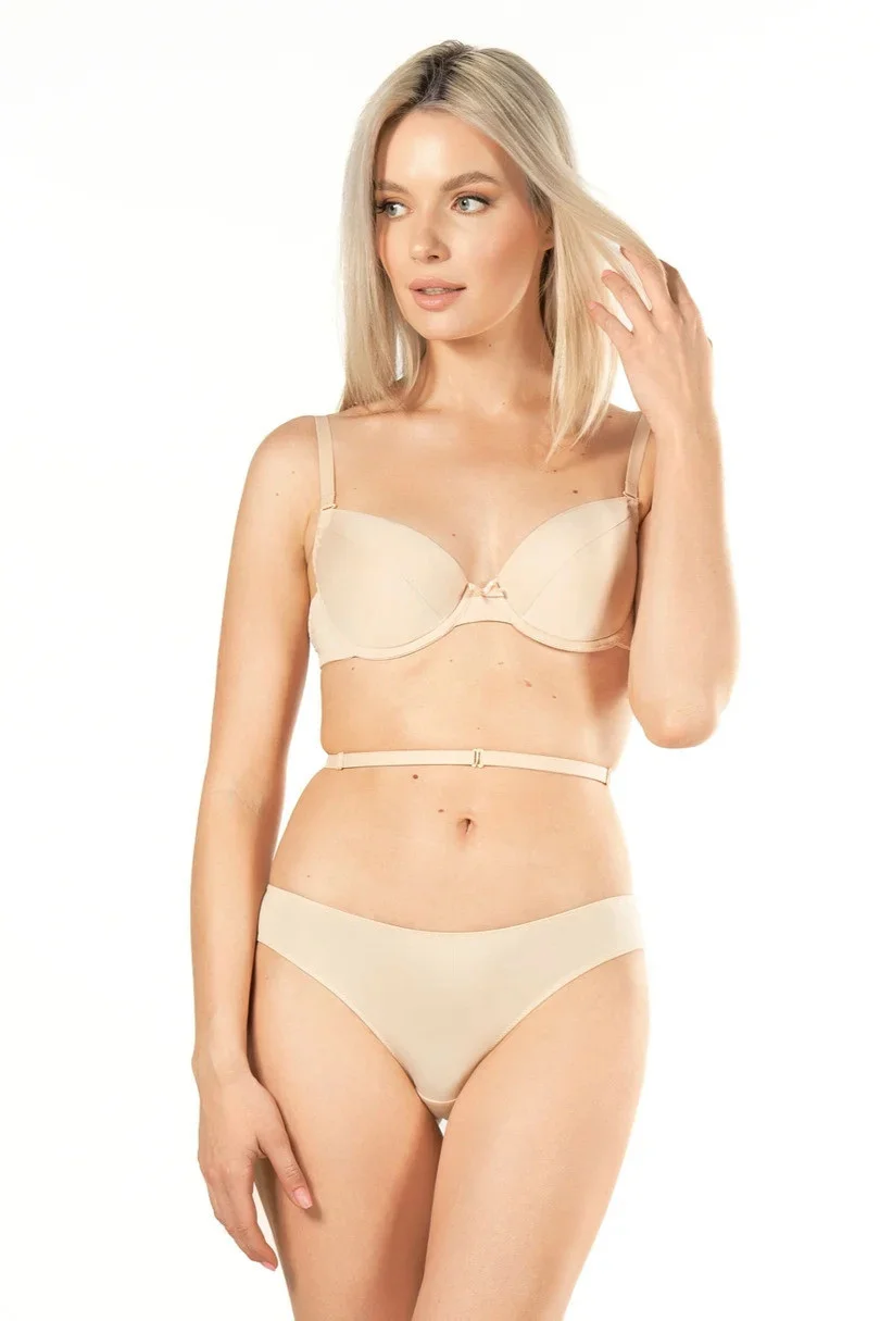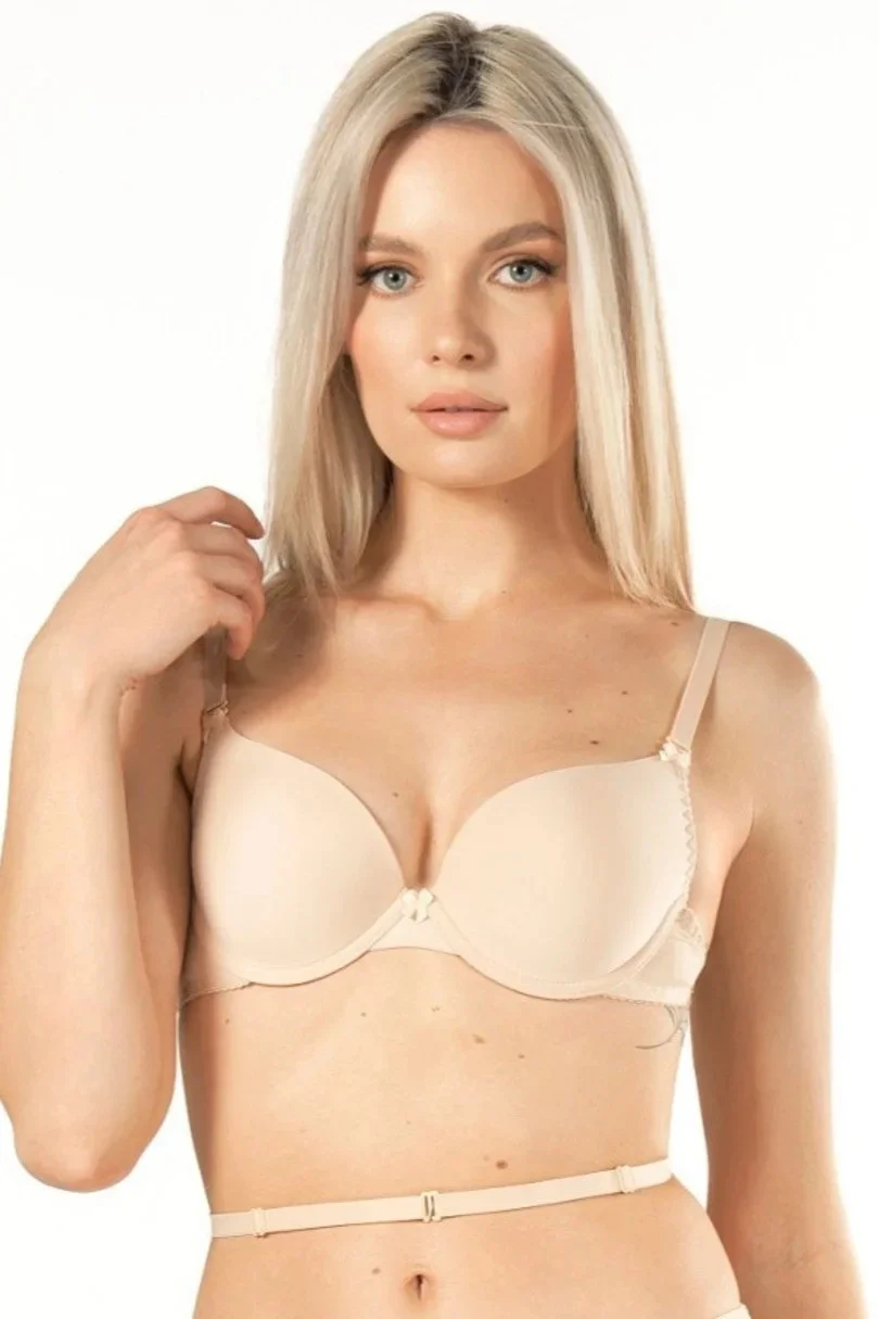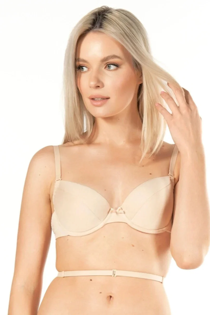 Push-up podprsenka, košíčky z hladkého mikrovlákna. Odnímatelná a nastavitelná ramínka, zkřížená na zádech, zapínaná na břiše.