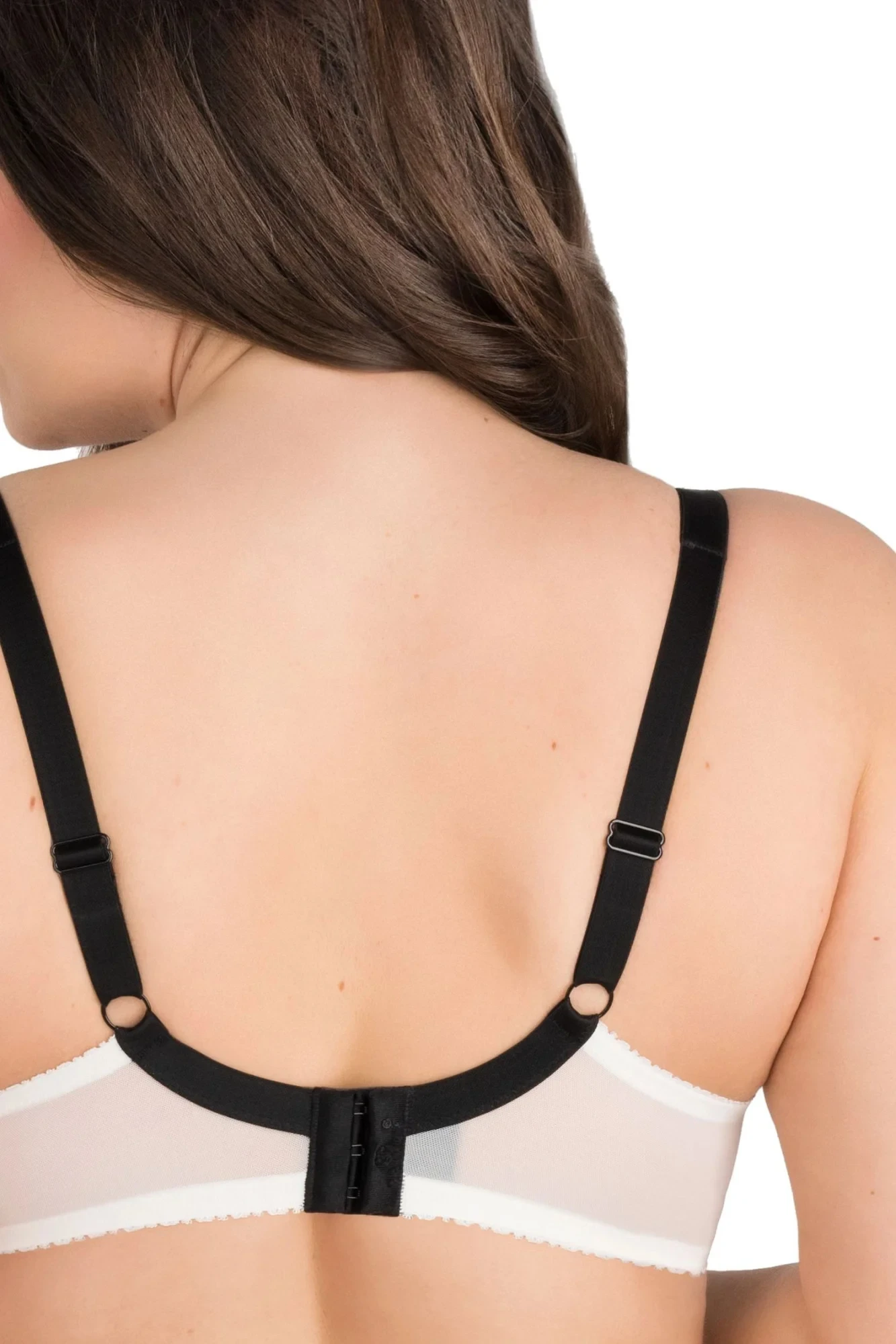 Dámská podprsenka 840 Black & white GORSENIA - bílá barva - typ soft - měkká podprsenka s kosticemi - košíčky zdobené krajkou s květinovým motivem - poskytuje efekt silného zvedání - boky ze stabilní síťoviny, bez boční kostice - pro ženy se středním a velkým poprsím - nastavitelná a neodepínatelná ramínka (větší velikosti vyztužené sametovou páskou) - zapínání na dva nebo tři háčky se čtyřstupňovým nastavením