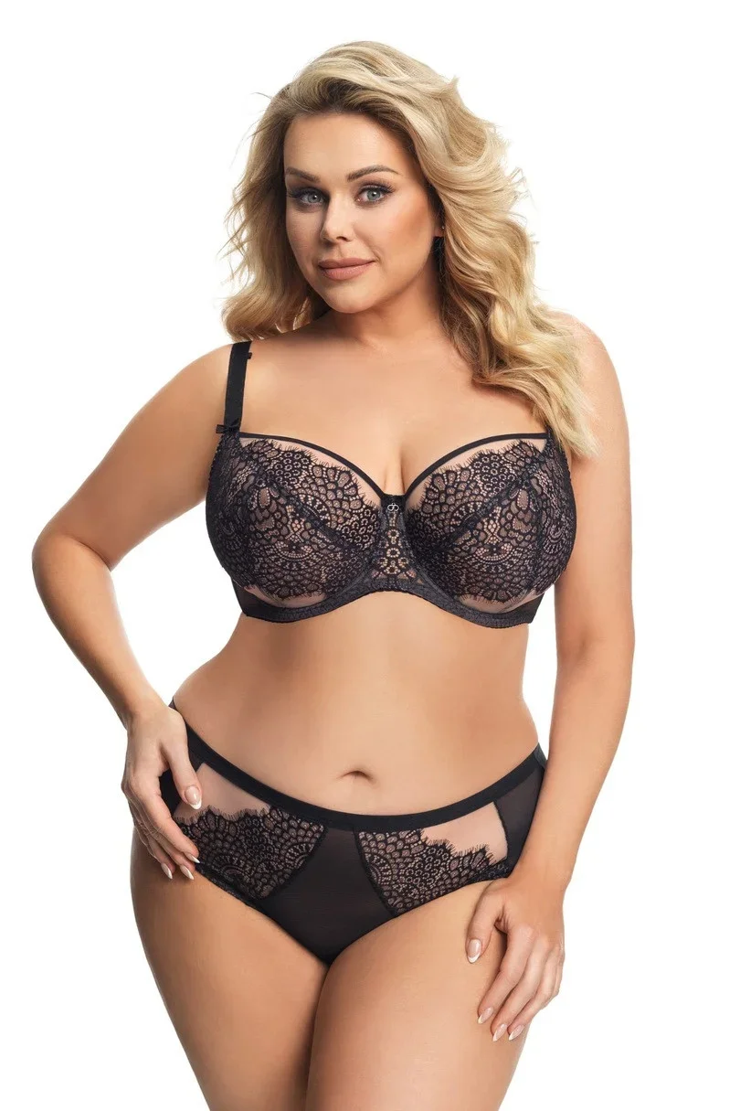 Podprsenka je vhodná pro ženy se středně velkým, velkým a velmi velkým poprsím. Model má módní vzhled, je pohodlný, svůdný a pěkně doplní vaše oblečení. Moderní a netypické provedení, spojení materiálů a ověřná konstrukce vytváří propracovanou podprsenku. Košíčky jsou vyrobené ze dvouvrstvého stabilního tylu a z jemné krajky. Košíčky jsou vytvarované drátkem a dokonale nadnáší poprsí a poskytují mu oporu. Model zdobí stabilní a elegantní černá krajka. Vrchní okraj modelu je olemovaný jemnou pružnou páskou. Můstek je ušitý z tylu a krajky. Boky modelu tvoří lycra s vysokou gramáží. Podprsenka má ve všech velikostech a rozměrech svislé boční kostice, a proto dokonale přiléhá k tělu. Model dokonale stahuje poprsí ke středu hrudníku, nadnáší jej a dodává mu pěkný oblý tvar.