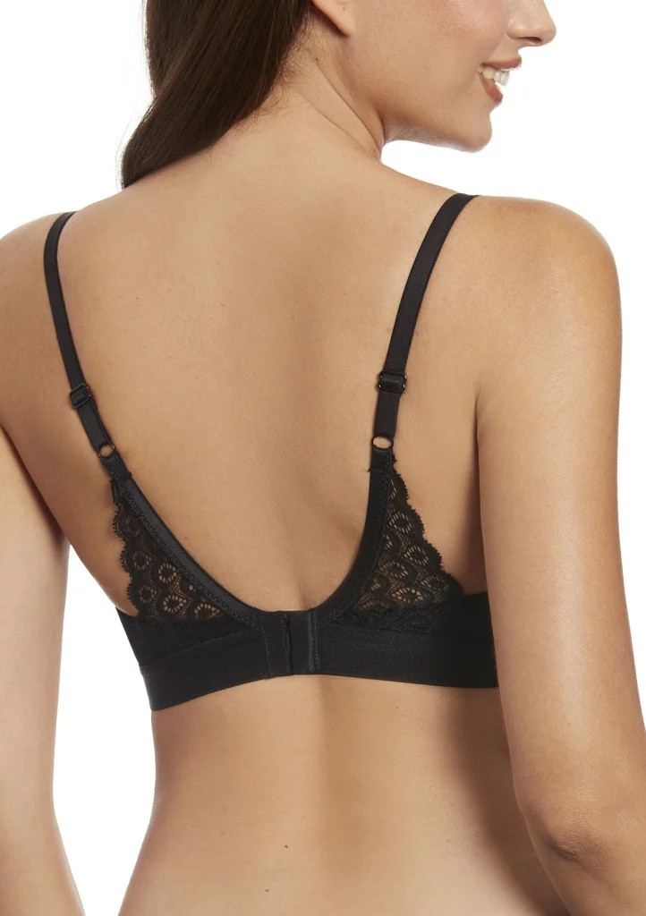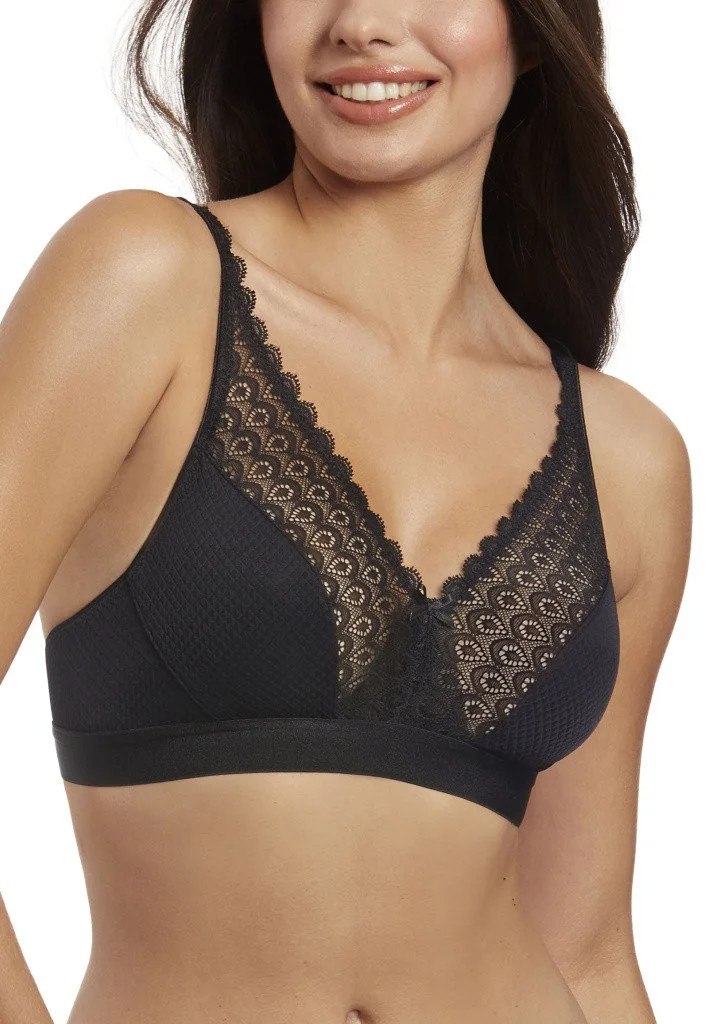 Dámská braletka od španělské značky Selene. Podprsenka má jemně strukturované nevyztužené košíčky bez kostic, které mají z vnitřní strany dekorovanou kraječkou sahající až k ramenům. Pevně všitá ramínka jsou lehce délkově nastavitelná. Spodní část podprsenky tvoří jemná pružná guma. Zadní část ramínek je zdobena krajkou, která sahá ke spodní části podprsenky. Zapínání je na dva háčky a čtyři řady.