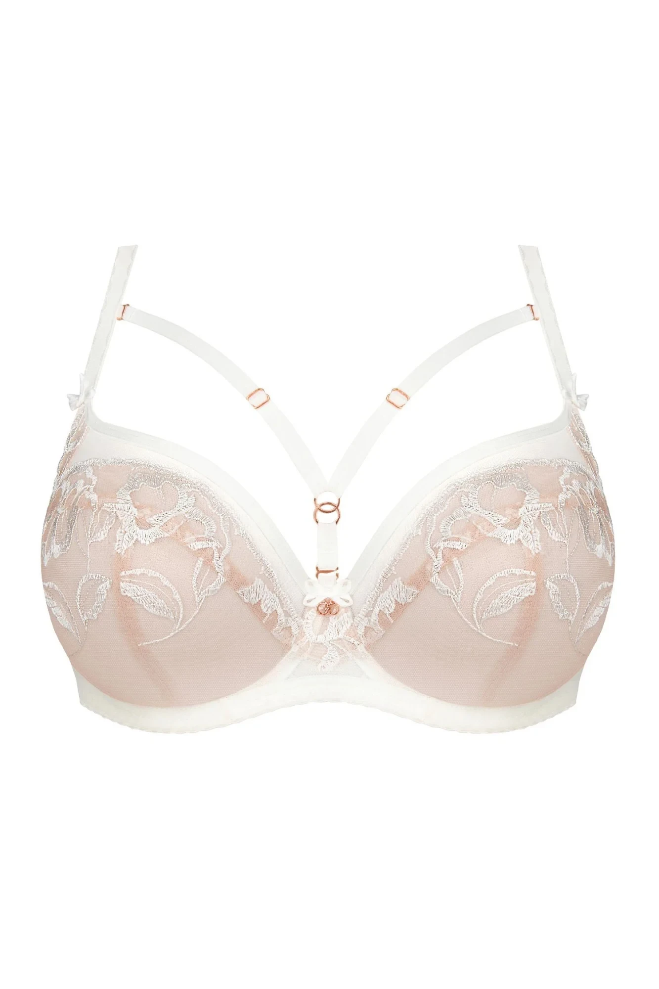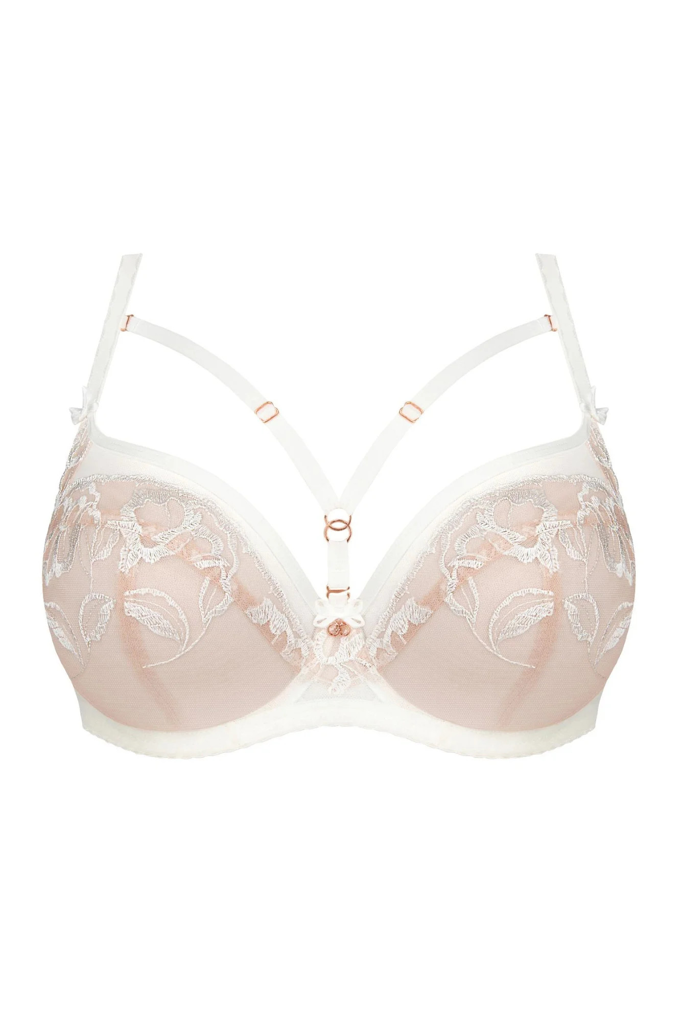 Dámská podprsenka 867 Cotton candy GORSENIA - krémová barva - typ soft - s kosticemi - plné košíčky zdobené výšivkou - podšité síťovinou - výstřih zdobený odpínatelnými ramínky s růžově zlatými ornamenty - nastavitelná a neodepínatelná ramínka - zapínání na dva nebo tři háčky s třístupňovým nastavením - efekt silného zvednutí