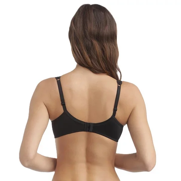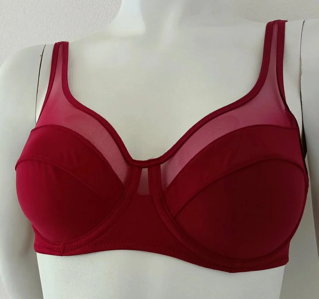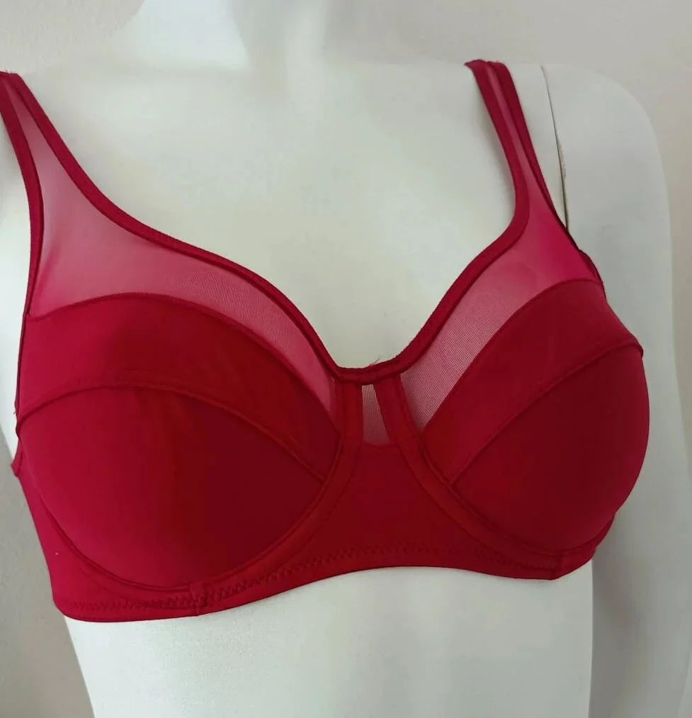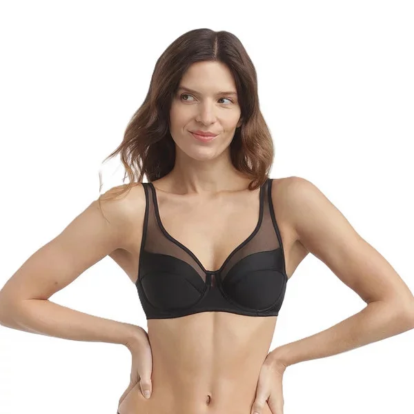 - Dámská podprsenka s kosticí, nevyztužená, s tylovou vrchní částí košíčků. Posouvací ramínka, zapínání na zádech.